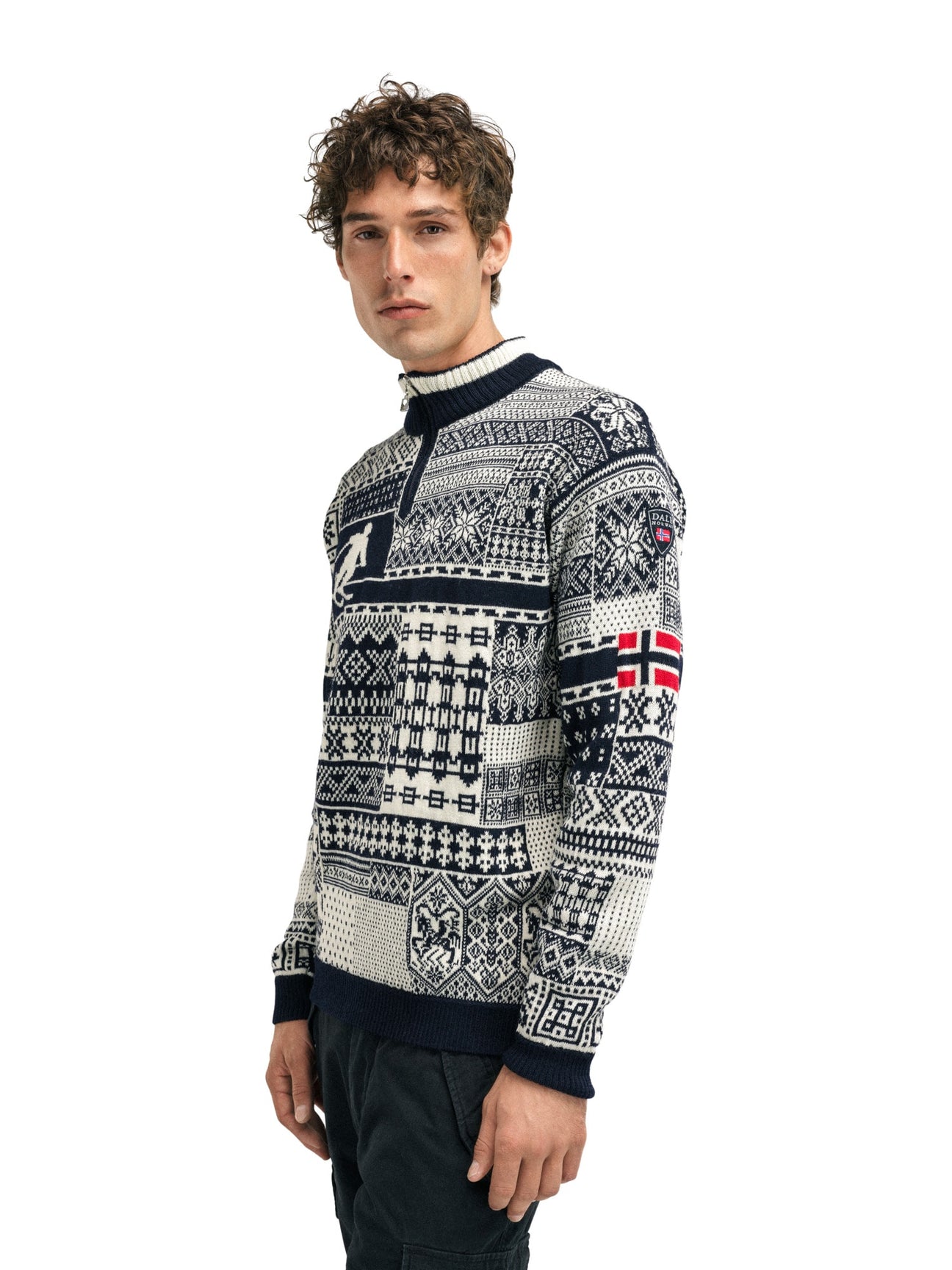 A timeless sweater with a clean design and sharp contrasts. The navy colored version of this sweater has a Norwegian flag stripe across the chest and inside the neck. This is a hint to its origin: This was the official 2017 World Championships sweater for the Norwegian Cross-Country ski team, held in Lahti, Finland. A modern classic, so to speak, made of 100% long-lasting wool. For extra comfort, the neck is lined with soft merino wool.