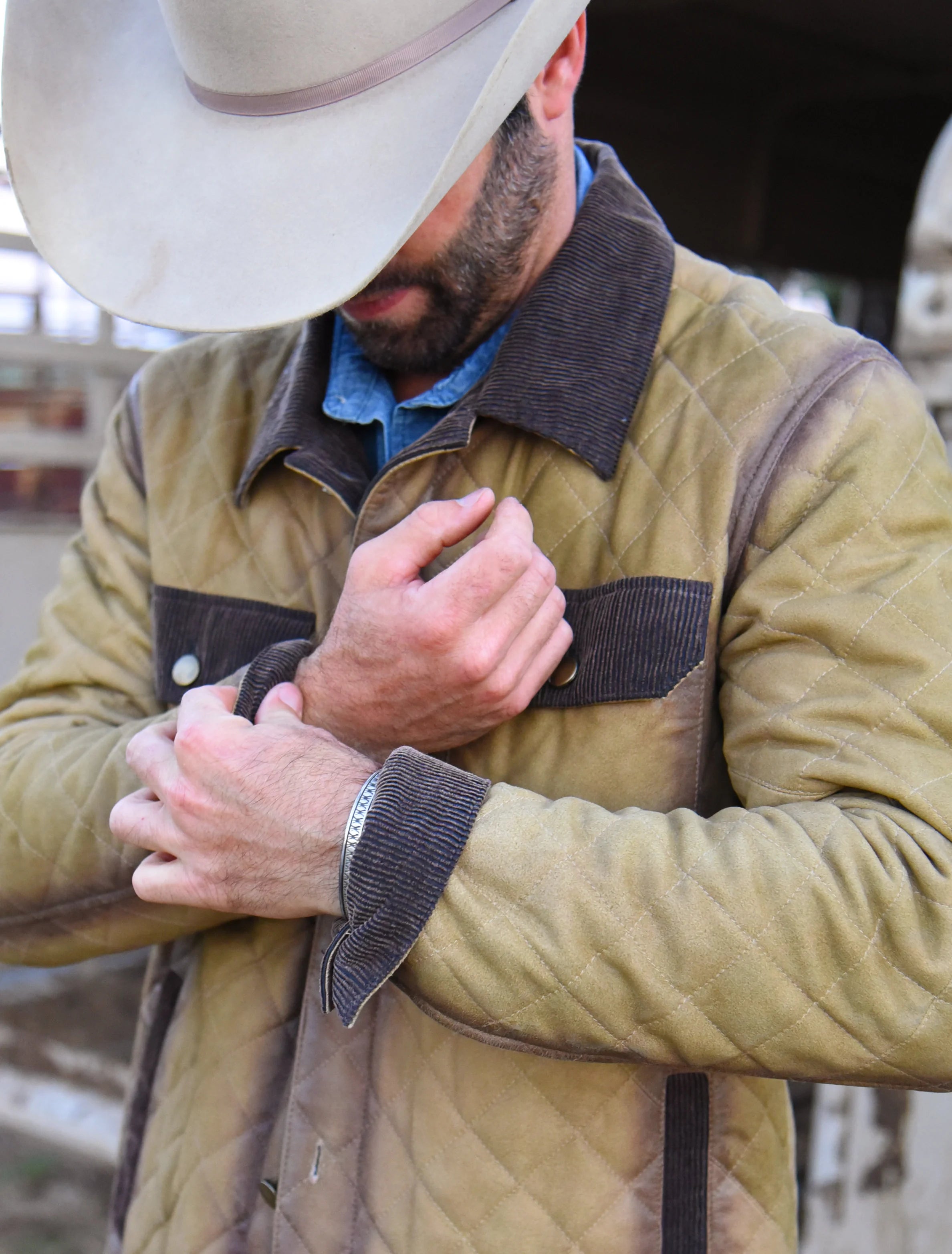 This men's Western jacket combines timeless appeal with distinctive character. Featuring authentic vintage leather with natural color and texture variations that develop a rich patina over time, each piece tells its own story. Diamond quilting accents and contrasting corduroy trim at the collar and pockets add refined detail to the classic silhouette. The light sanding technique enhances the aged aesthetic, creating a jacket that looks like a cherished heirloom from day one. Perfect for those who appreciate genuine craftsmanship and want a statement piece that only gets better with wear.