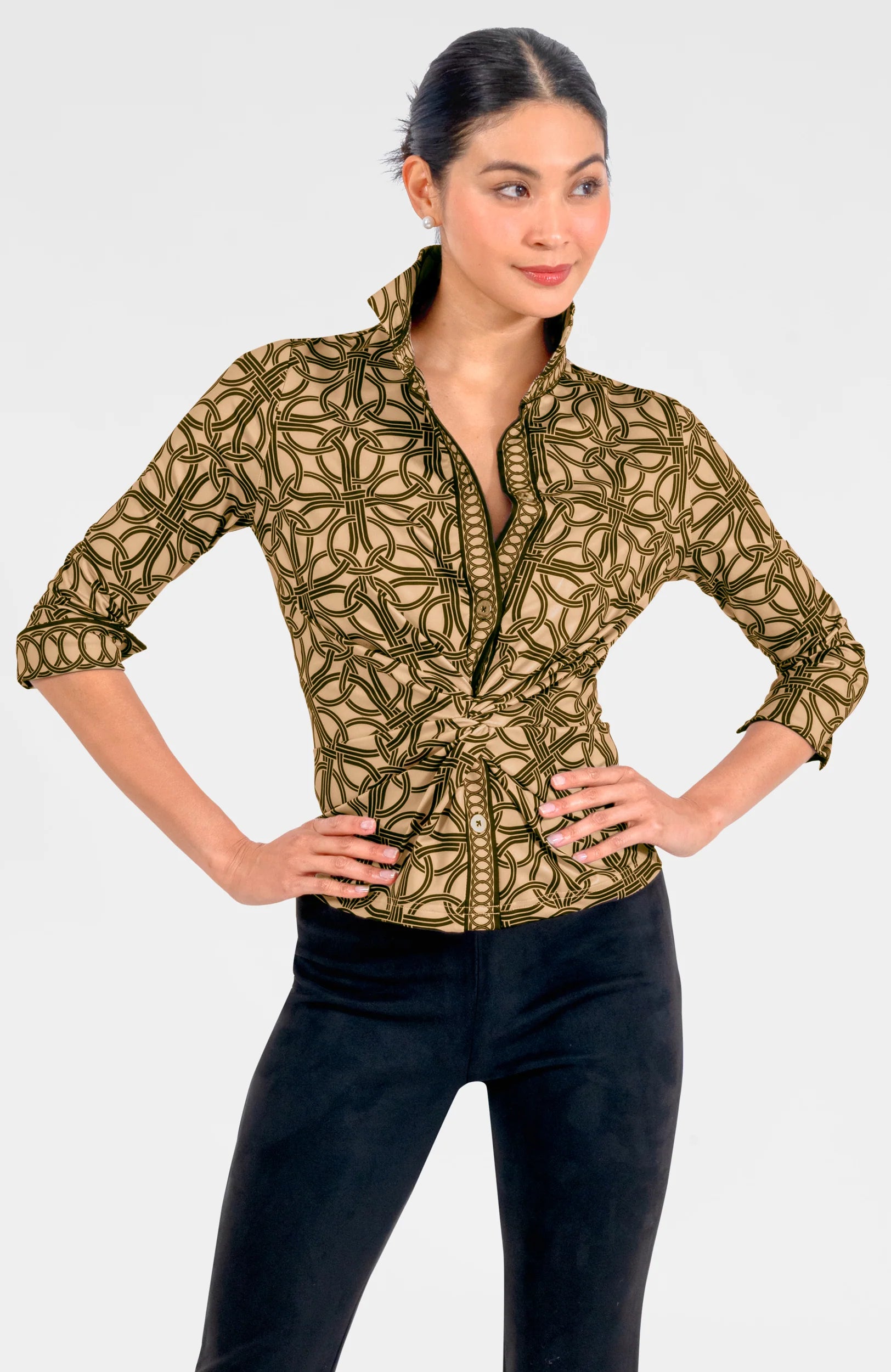 Turn heads in the Gretchen Scott Twist & Shout Top, featuring the bold and playful Ring Toss print. Designed for effortless elegance, this women’s blouse combines eye-catching color, easy comfort, and flattering structure — perfect for work, travel, or everyday wear.