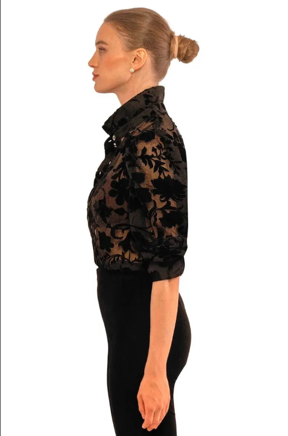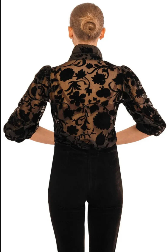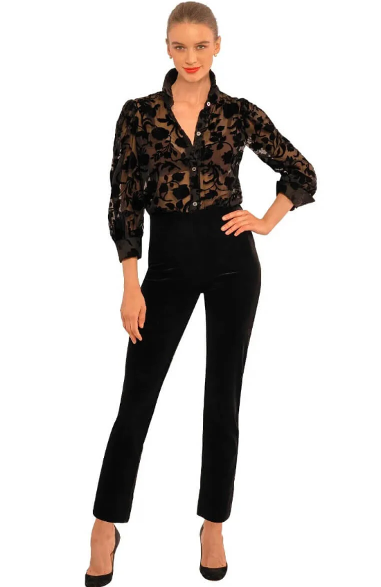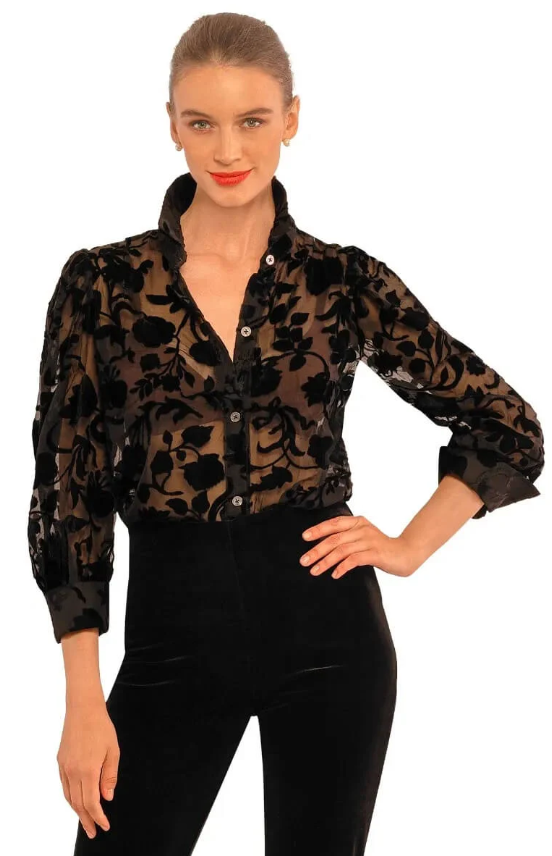 Elevate your wardrobe with the Velvet Floral Burnout Juliettee in Black by Gretchen Scott. This women's blouse combines luxurious velvet texture with a delicate floral burnout design, creating a sophisticated and feminine look. Its lightweight feel ensures comfort all day, making it perfect for both casual outings and dressier occasions. Add an elegant touch to your style effortlessly with this versatile statement piece.