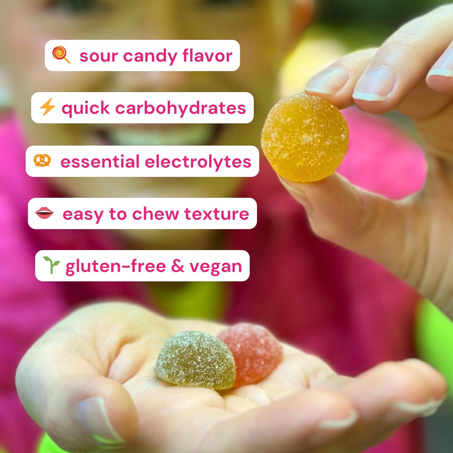 Ingredients: Glucose, Sugar, Water, Pectin, Citric Acid, Natural Flavor, Sodium Citrate, Lactic Acid, Sea Salt, Green Spirulina for color, Potassium Citrate.