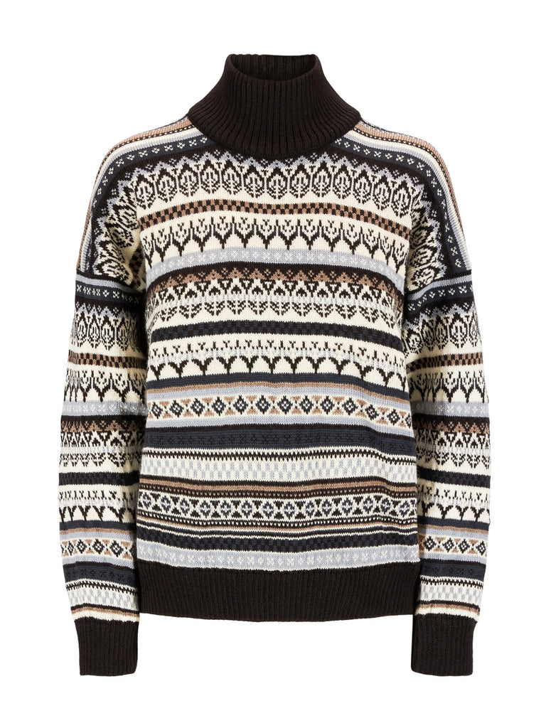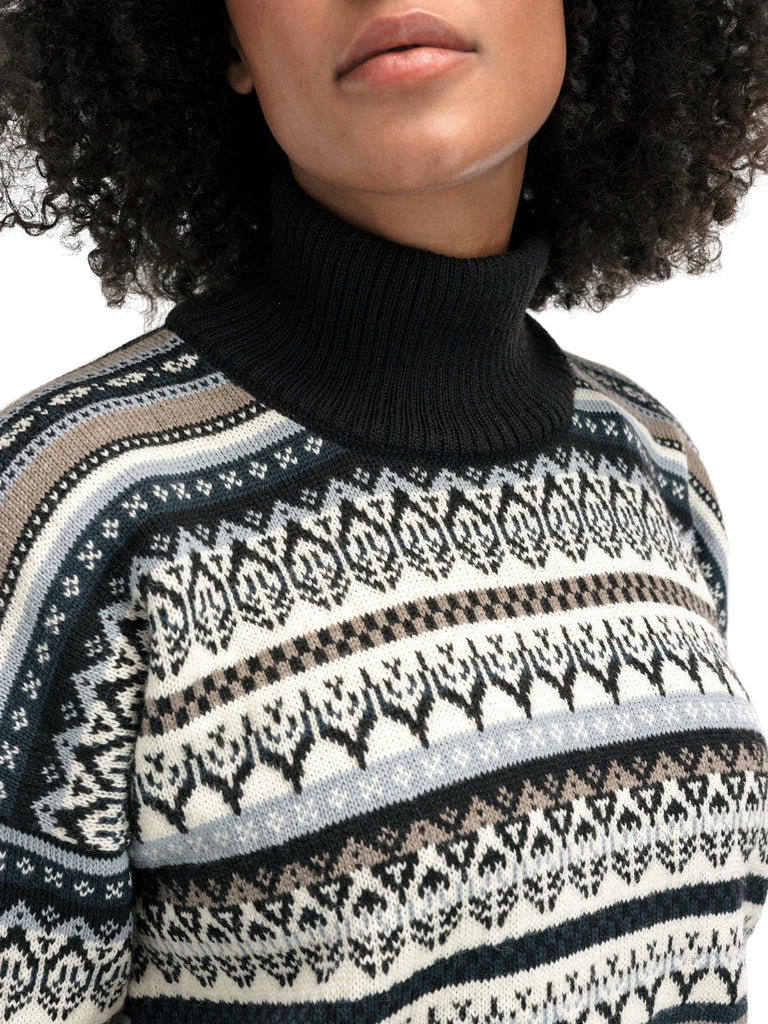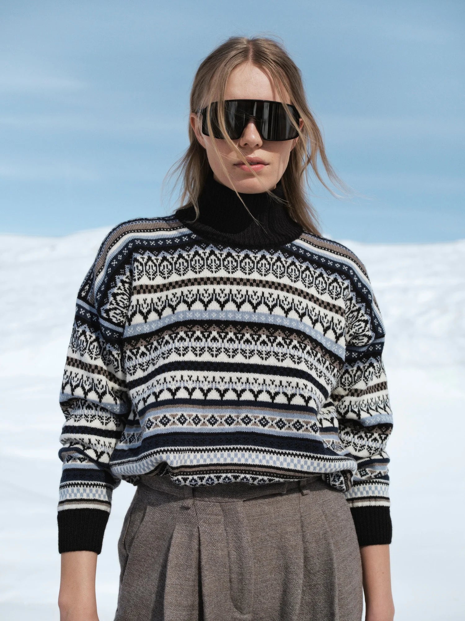 The Utsira Sweater combines timeless Norwegian design with a relaxed, oversized fit, showcasing a blend of historic Dale patterns in a playful, fully patterned style. Crafted from 100% long-lasting wool, this sweater features a high neck and dropped shoulders, giving it a unique silhouette with smaller ribbed endings at the sleeves and hem. Made for comfort and warmth, Utsira is perfect for cozy days and outdoor adventures alike.