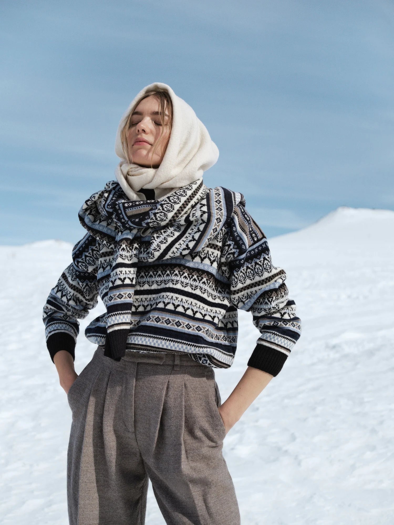 Inspired by Utsira, a vibrant island known for its colorful art, this wool sweater combines heritage patterns with a contemporary oversized fit, offering both style and warmth for your winter wardrobe.