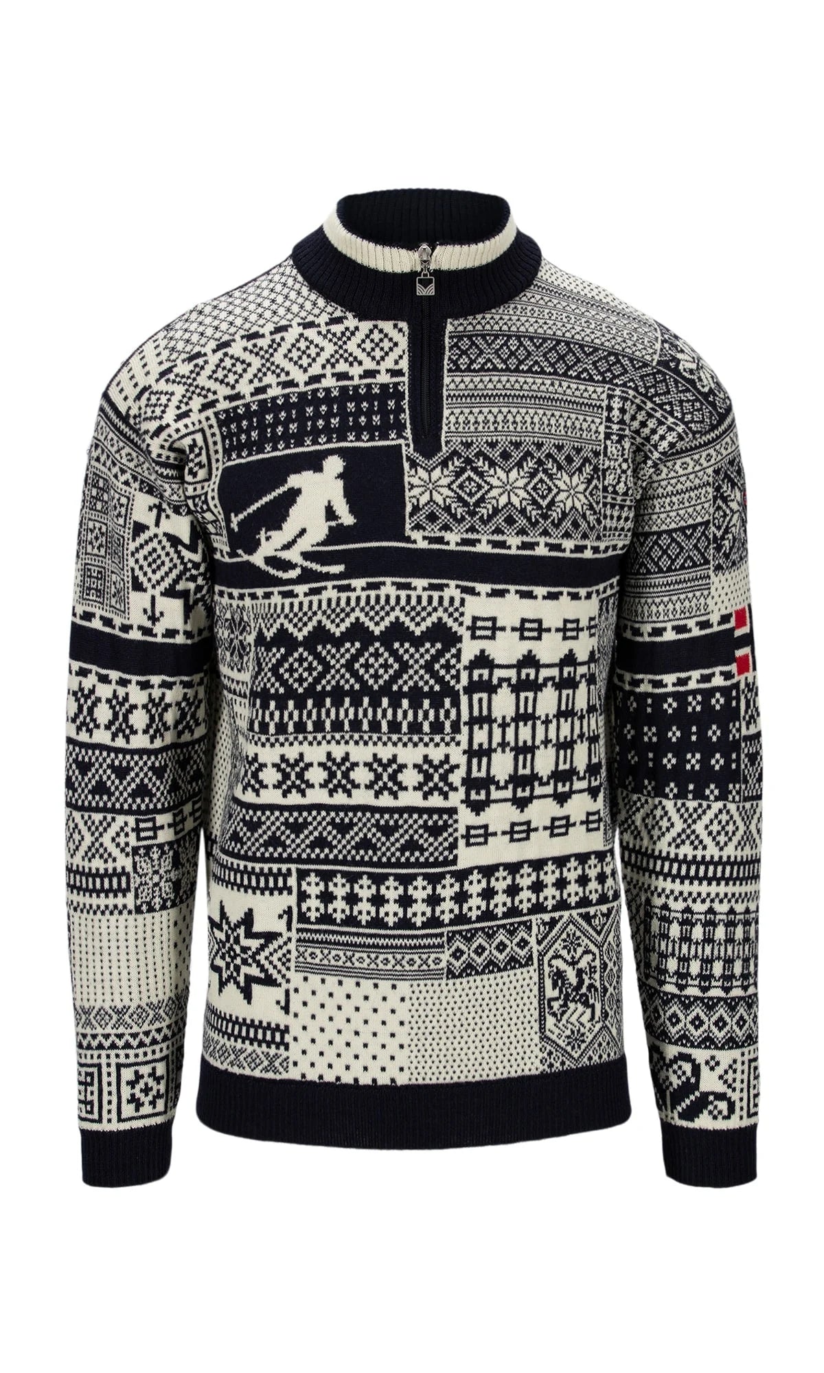 Ever since 1956 we have made official Olympic team sweaters for the National Norwegian Cross-Country ski team. This sweater is a tribute to our Norwegian Olympic history, with a pattern based on all our 18 official team sweaters.