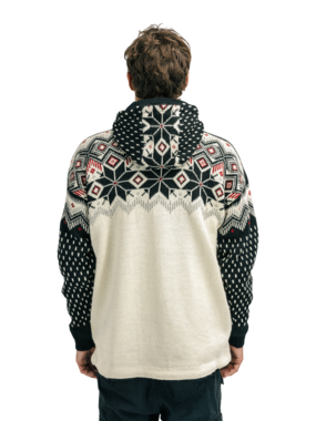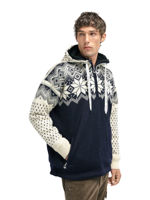 The Vegard weatherproof wool hoodie is crafted from 100% durable Norwegian wool with a water-resistant treatment (8,000 mm) and a breathable, windproof lining. Designed for outdoor comfort, it features a loose fit, heavy knit, quarter zip, zippered front pockets, and a drawstring hood lined with ultra-soft merino wool. Weighing 1450g (size L), it is designed and knitted in Norway. Hand wash only.