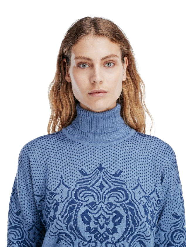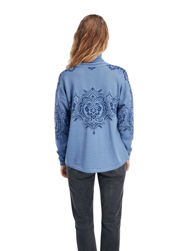 This ultra-soft, lightweight sweater is crafted from 100% skin-soft merino wool and features a high ribbed neck. It showcases an intricate floral pattern inspired by classic Dale designs, complemented by a traditional lice pattern on the shoulders. With a regular fit, a slightly shorter front, and a wide silhouette, it can be easily tucked in for a casual look. Weighing 350g (size M), it is designed and knitted in Norway and is machine washable on a wool cycle. The model, 179 cm tall, wears a size Medium.