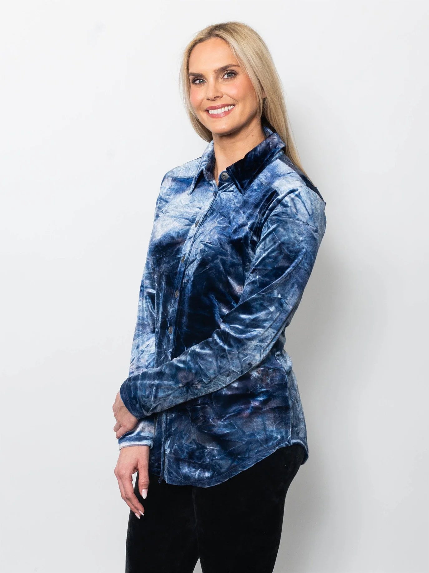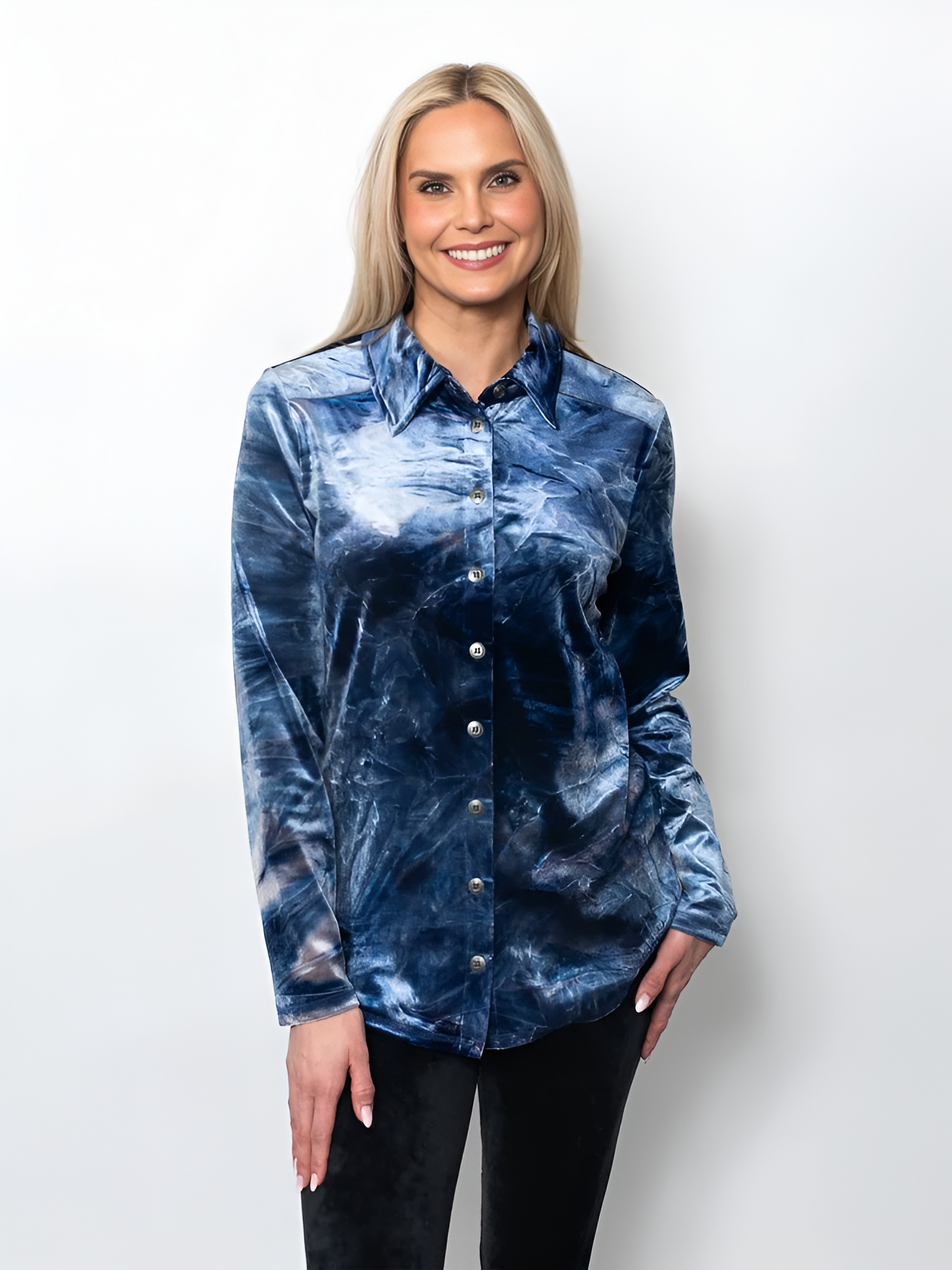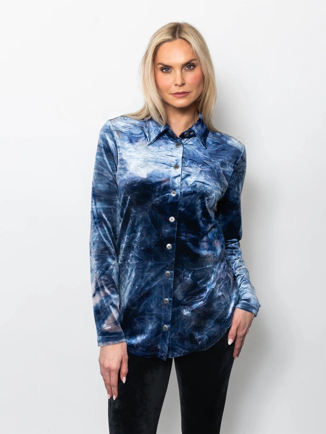 Elevate your wardrobe with the bold sophistication of our Tie Dyed Velvet Button-Up Shirt, a modern statement piece designed for standout style and everyday comfort. Crafted from soft stretch velvet, this women’s button-up velvet top combines timeless tailoring with an eye-catching blue tie-dye finish for a look that’s effortlessly chic.
