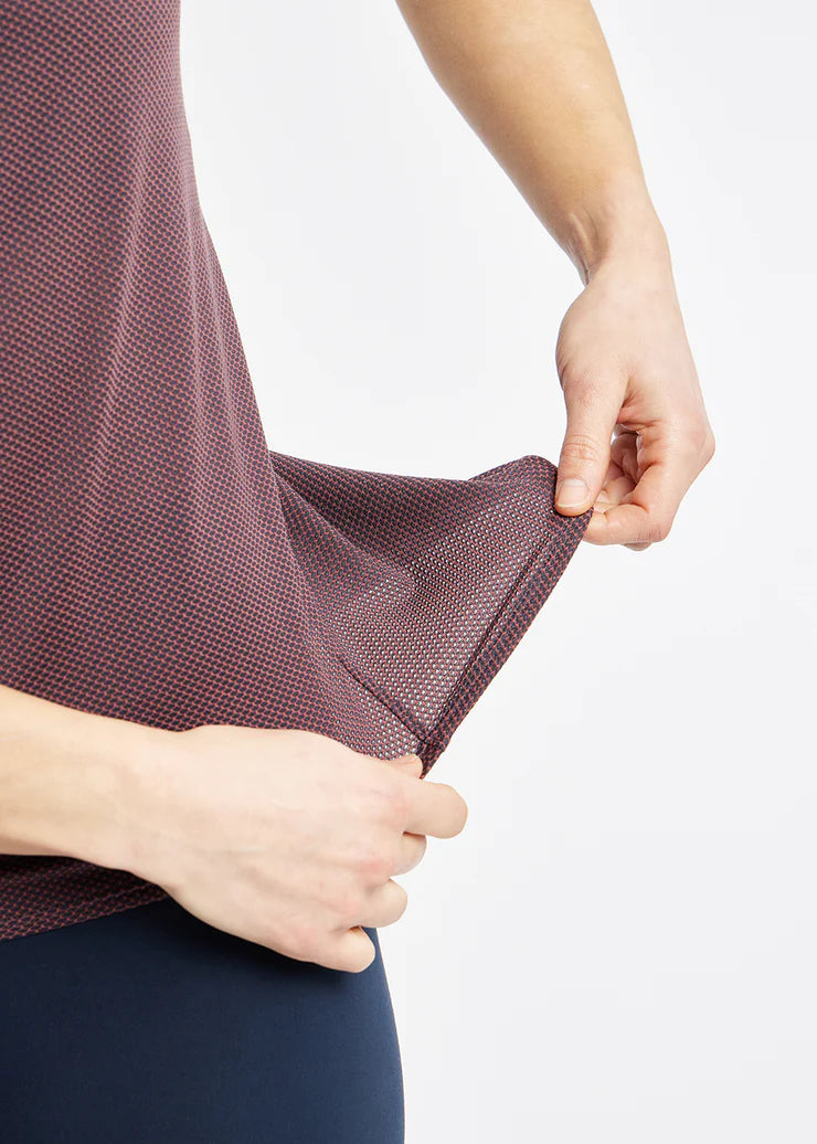 - Redesigned to integrate a hi - low hem with Oiselle's signature side seam design for a contoured fit