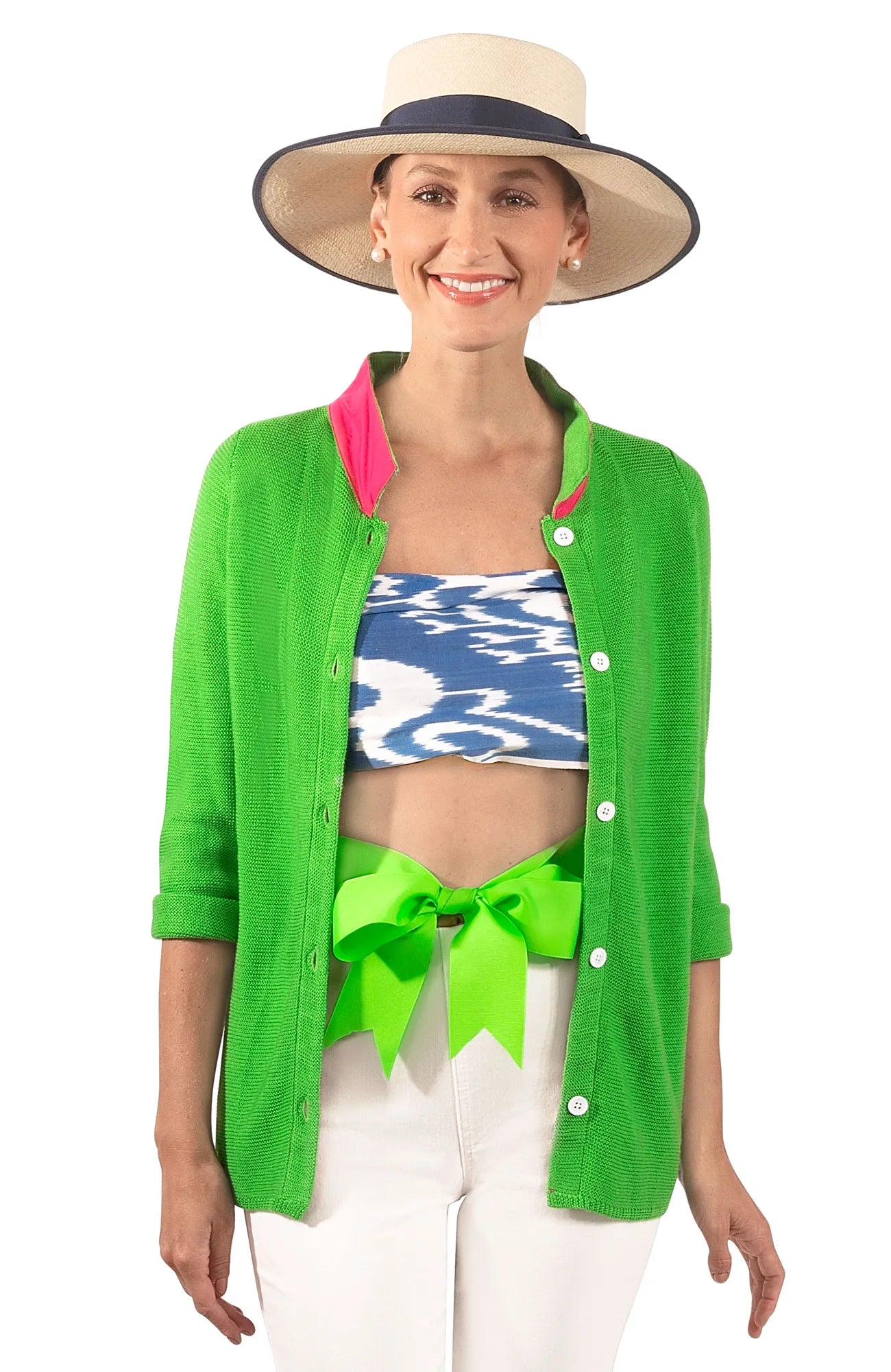 Elevate your style with our 26" length garment, featuring a chic shell button-front closure for a polished look. Contrast cotton grosgrain fabric accents on the inside front placket and under the collar add a touch of sophistication. Stay cozy with long sleeves and embrace versatility with 9" side slits. The garter stitch with crochet edging and ribbed hem add a charming detail. Crafted from a blend of 100% acrylic and cotton grosgrain, it's easy to care for with a simple machine wash cold and lay flat to dry routine.
