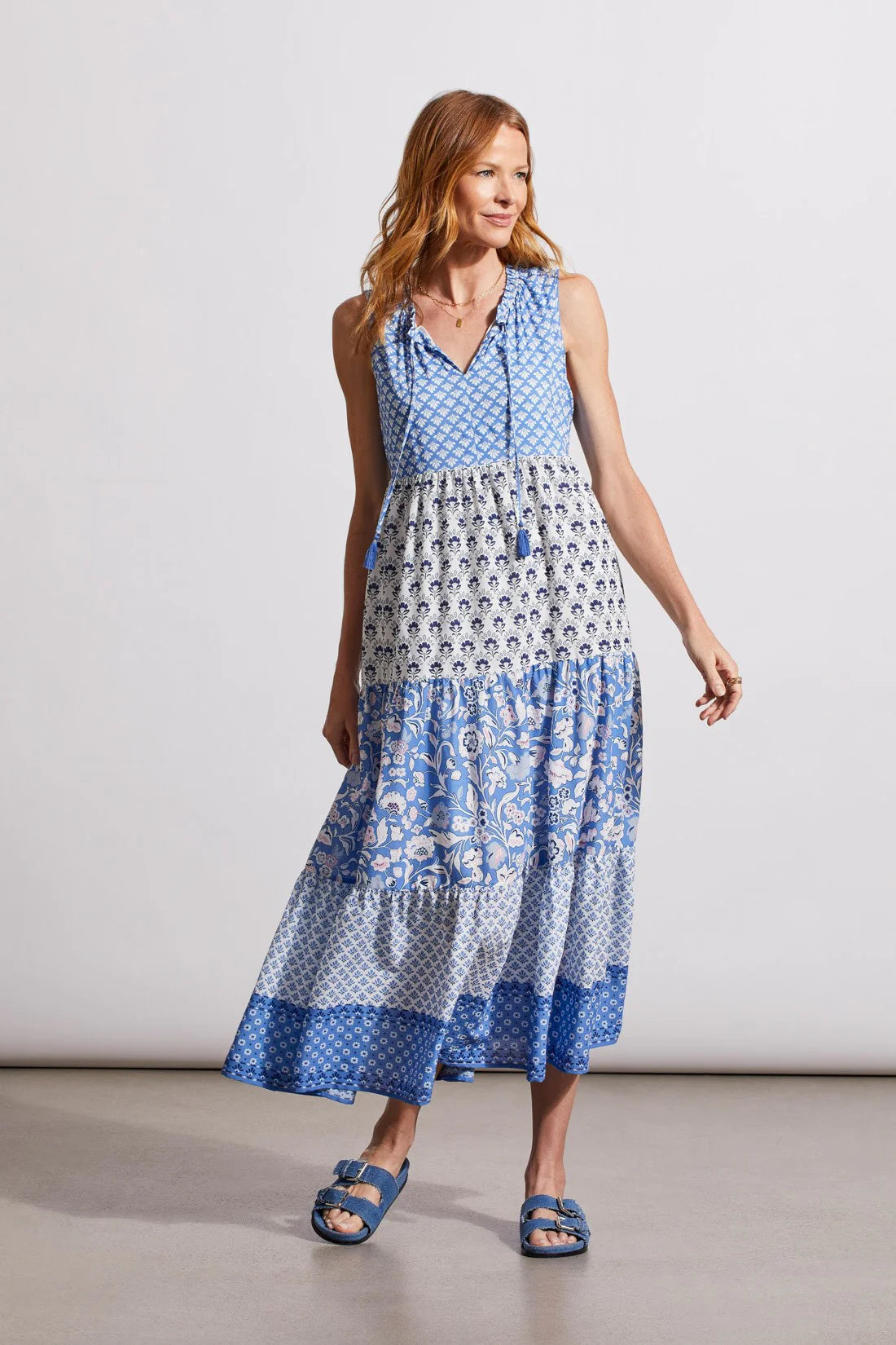 Update your style with this breezy and breathable sleeveless dress featuring a vibrant print. We love the maxi length, flowy tiered skirt, tasseled neckline, and comfy lining.