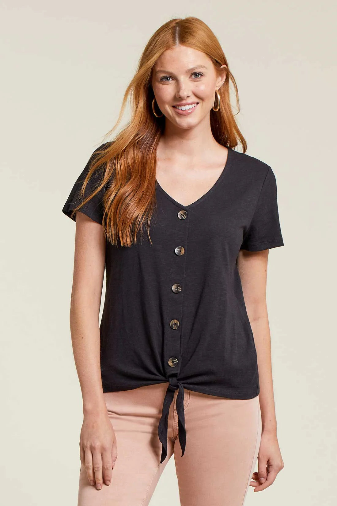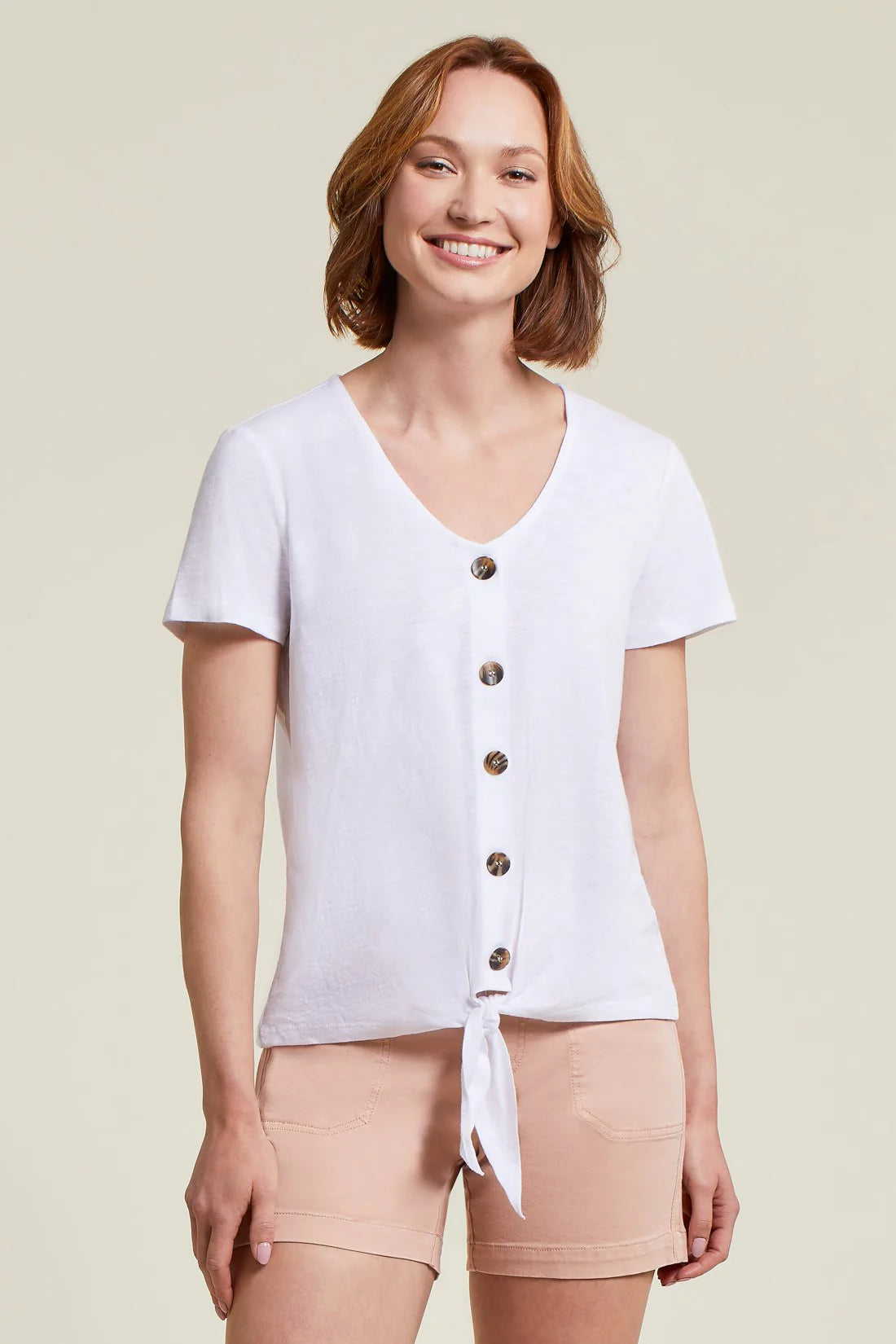 Achieving that laid-back yet pulled-together look has never been easier now that you've laid eyes on this short-sleeve top. We're loving the v-neckline, casual knotted hem, and cascade of horn buttons running from top to bottom. From sports practice to parties, this chic shirt will have you radiating an easy-breezy style.