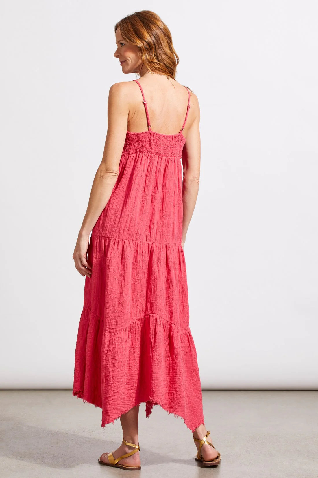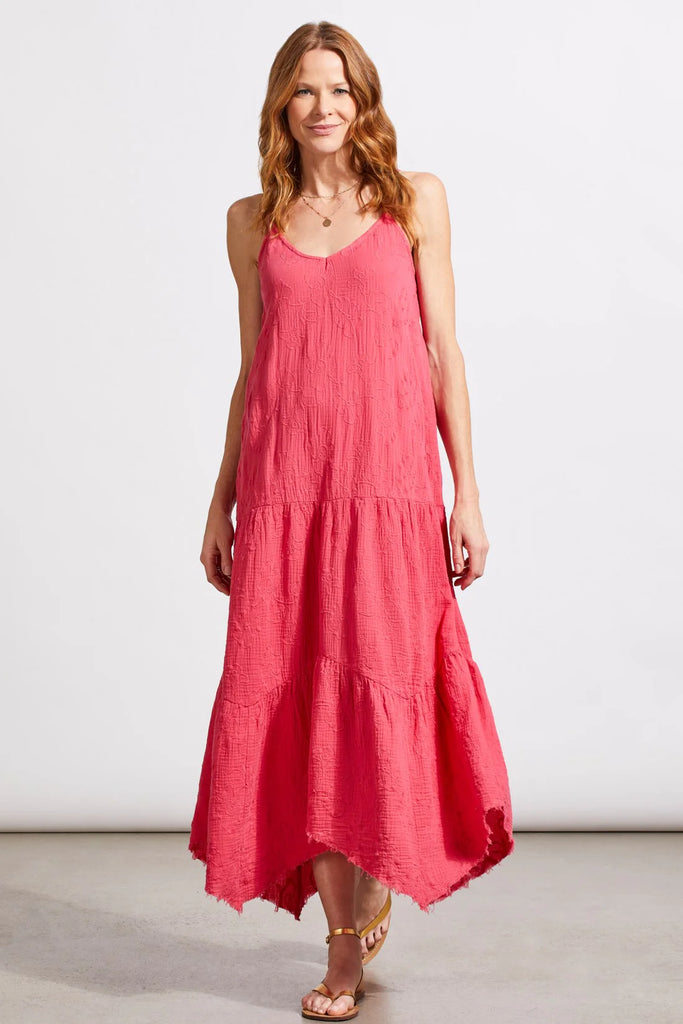 Effortlessly transition from one destination to the next with this versatile maxi dress, featuring an enchanting asymmetrical handkerchief hem and airy cotton gauze fabric adorned with intricate embroidery. The flattering V-neckline, graceful 48" length, and sleeveless design with adjustable spaghetti straps ensure a perfect fit for any occasion.