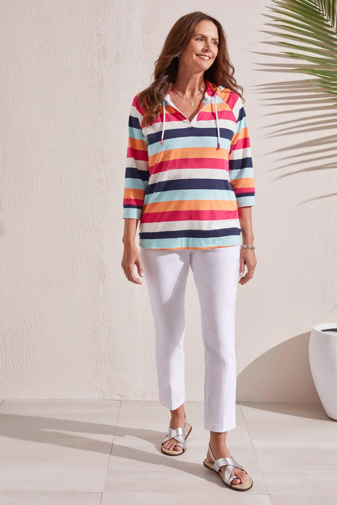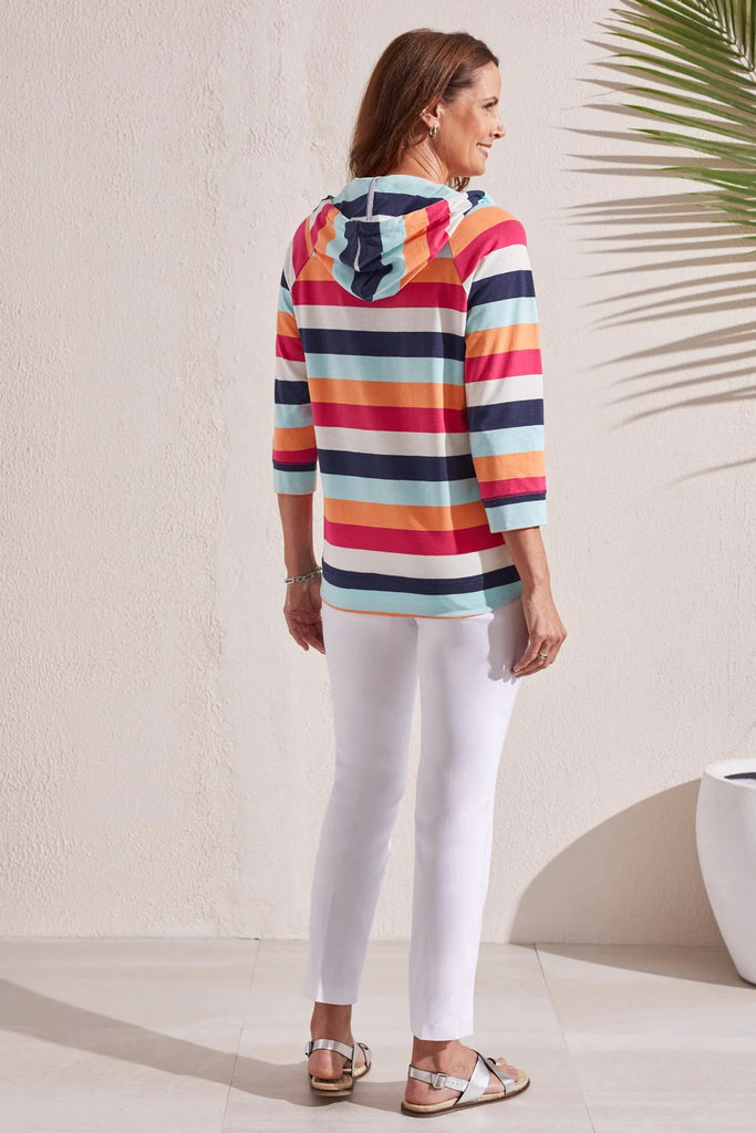 Craving coziness that won't weigh you down? This raglan hoody is ready to check all your boxes with an airy notch neckline, three-quarter sleeves, flattering shirttail hem, and fabric patterned with colorful stripes.