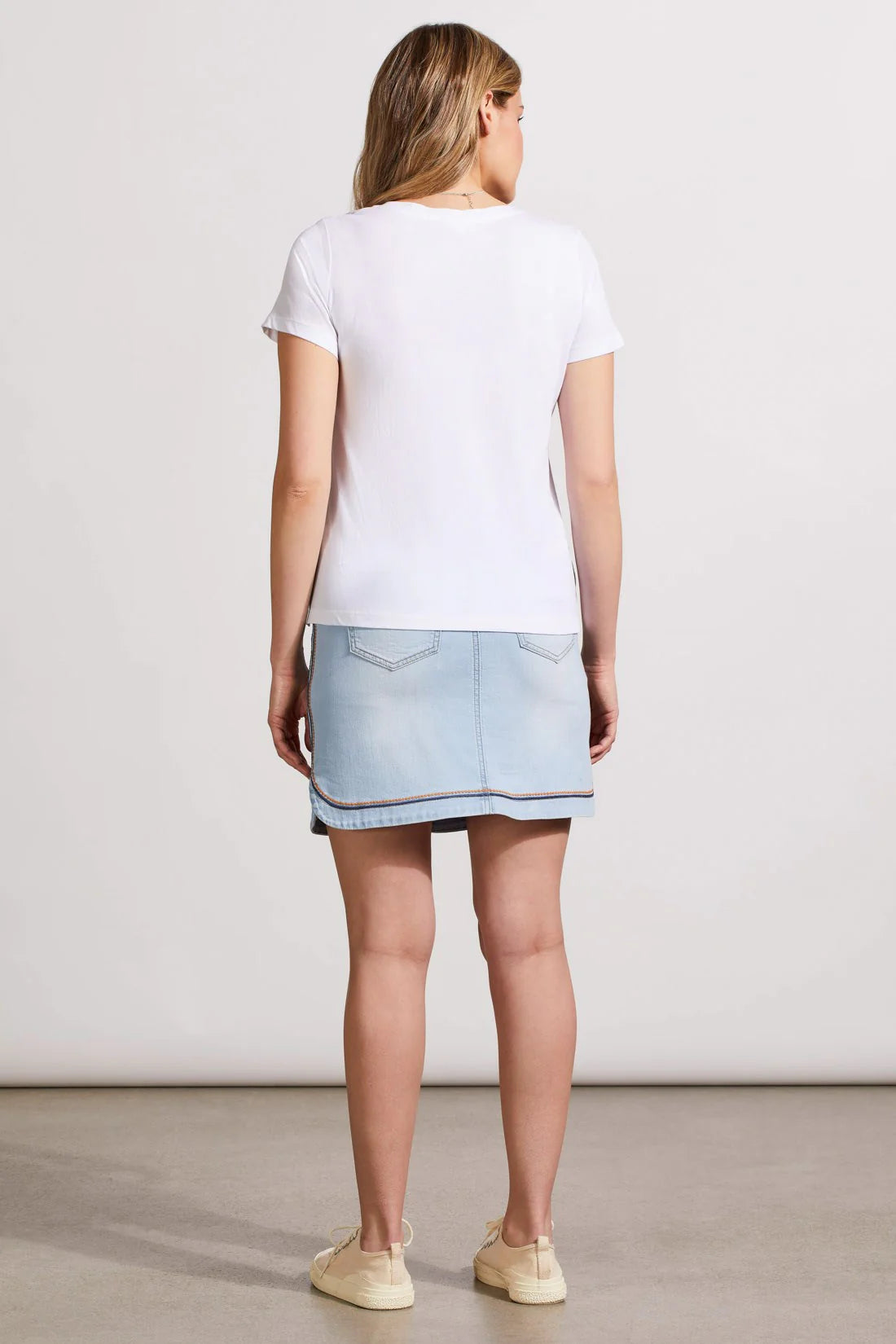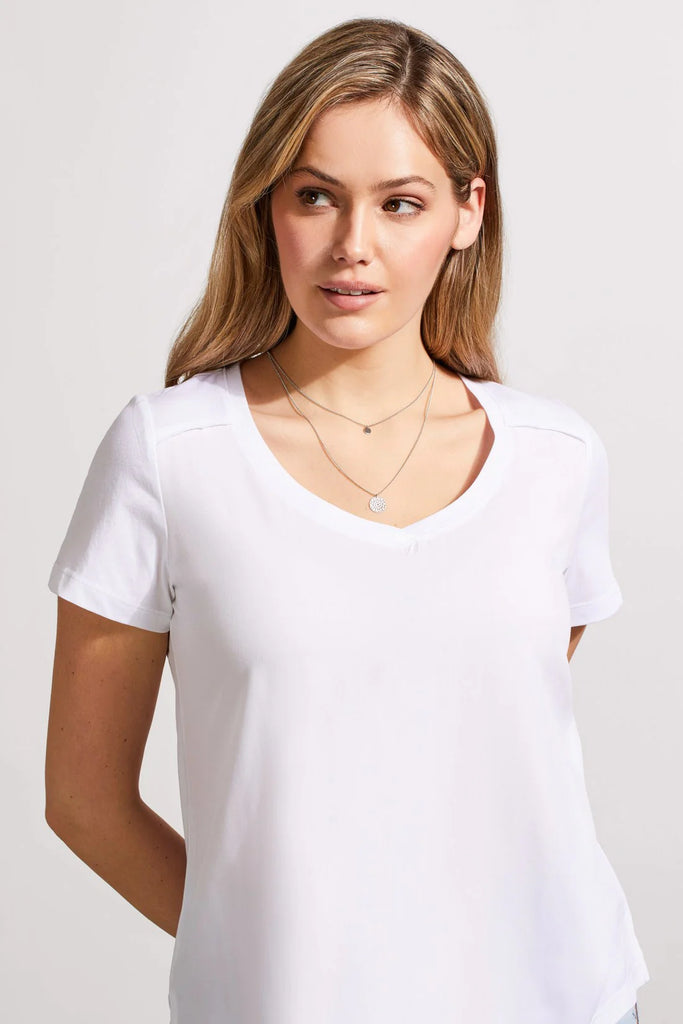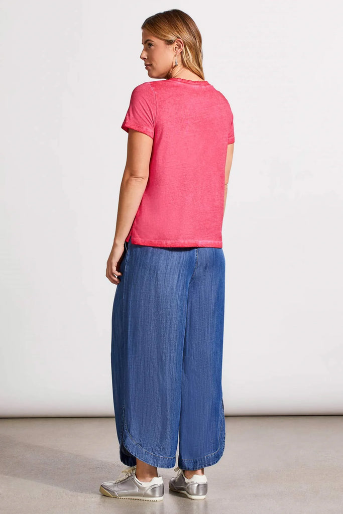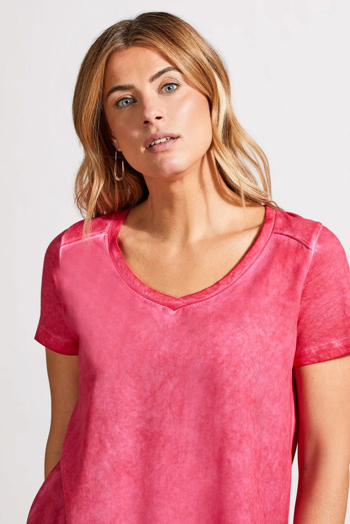 Upgrade your casual wardrobe with this chic short-sleeve top, featuring a flattering V-neckline and easy pull-over style. Made from a unique blend of soft touch knit and woven cotton panels, it offers both comfort and sophistication. The special vintage wash provides a retro vibe, while raw edge detailing adds a modern twist.