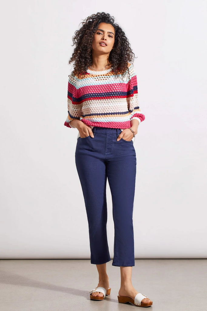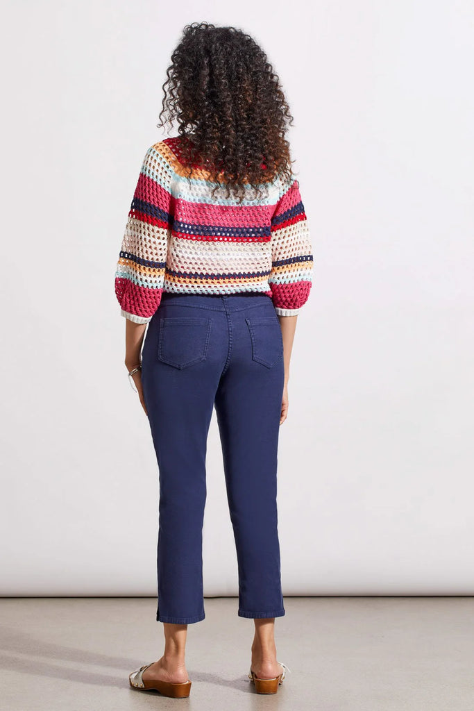 A flattering silhouette paired with a comfortable feel? Yes, please! These pull-on capris fulfill all our style requirements with soft stretch twill fabric, an elastic waist with a decorative fly and functional belt loops, a 5-pocket design, slim fit, 25" inseam, and hem slits.