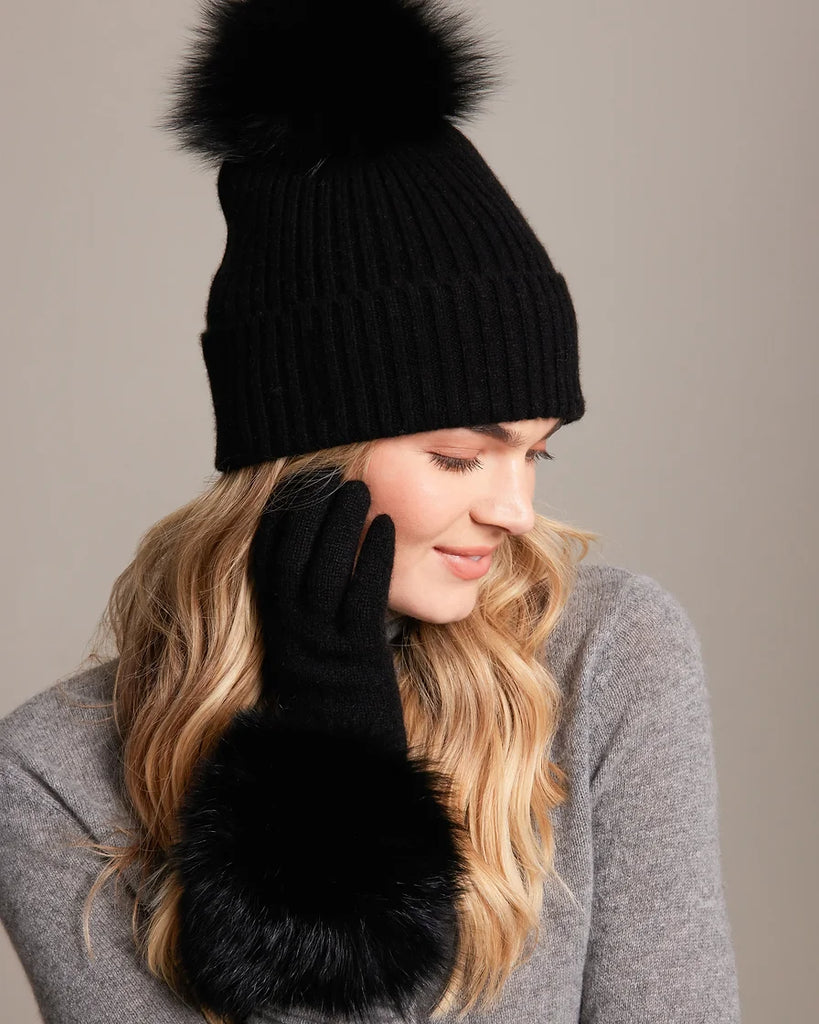 Alashan Cashmere | Ribbed Knit Cashmere Hat with Fox Fur Pom