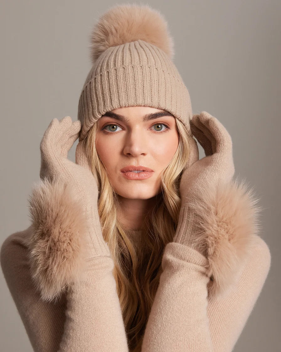 Alashan Cashmere Ribbed Knit Hat with Fox Fur Pom – Luxurious Warmth & Elegance