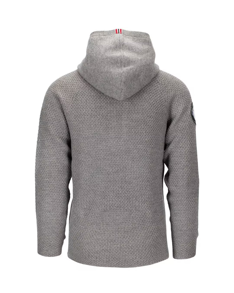 The front and hood of the sweater is knitted extremely big and the boiled back to its rights size. This technique to make clothing for mountain people and seafarers alike was a great way to obtain unequalled warmth, water and wind resistance.