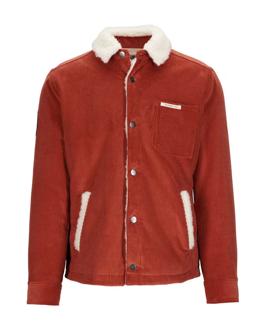 Overshirt in water-resistant stretch cotton corduroy lined with wool fleece. With its full front buttons and hand-warmer pockets it is designed to be worn over a sweater. A companion for spring, summer and fall.