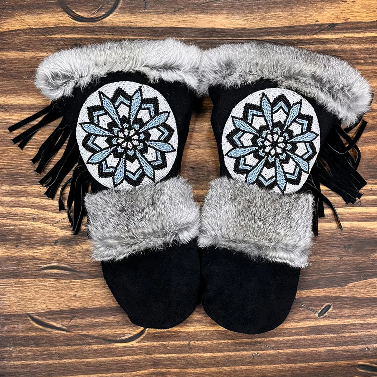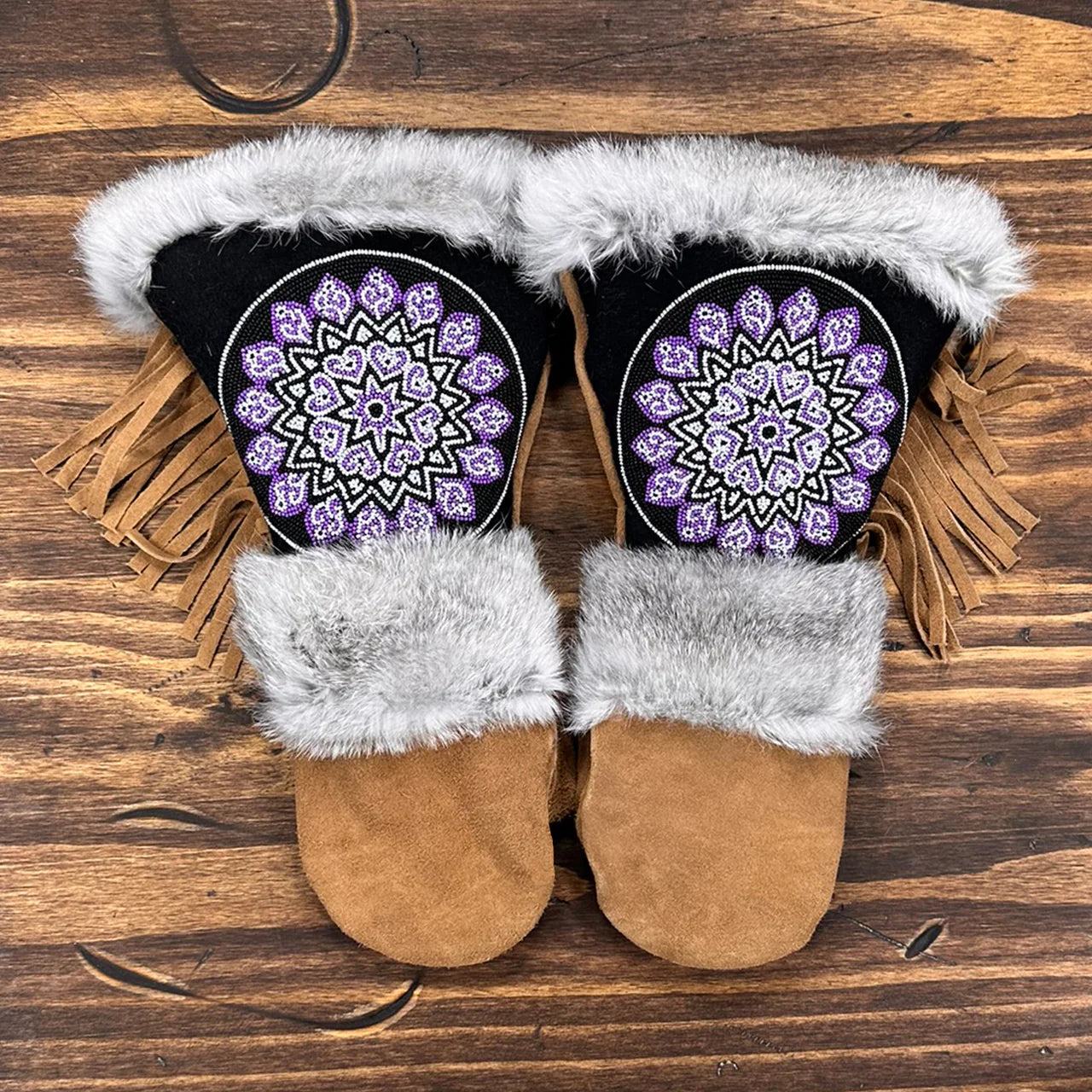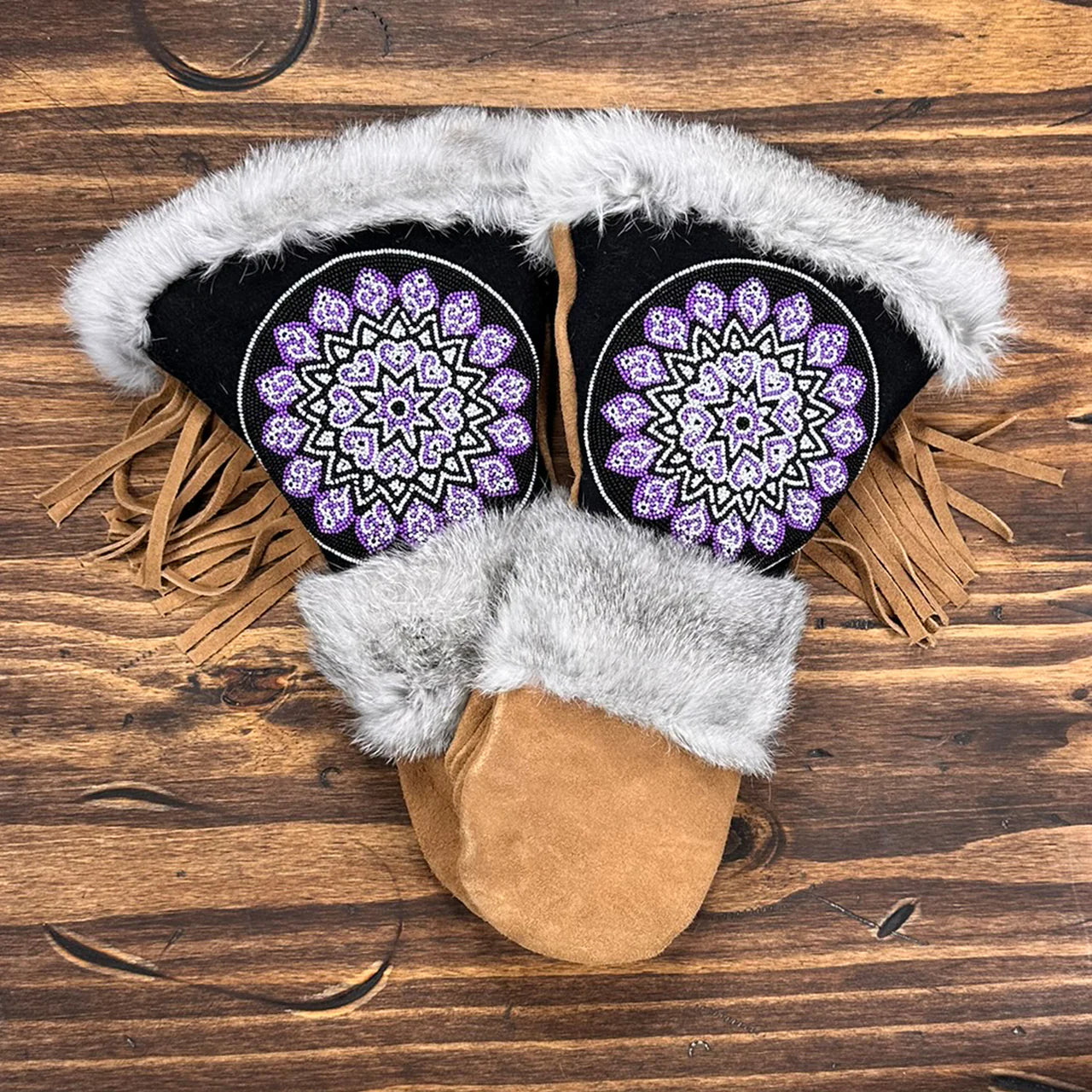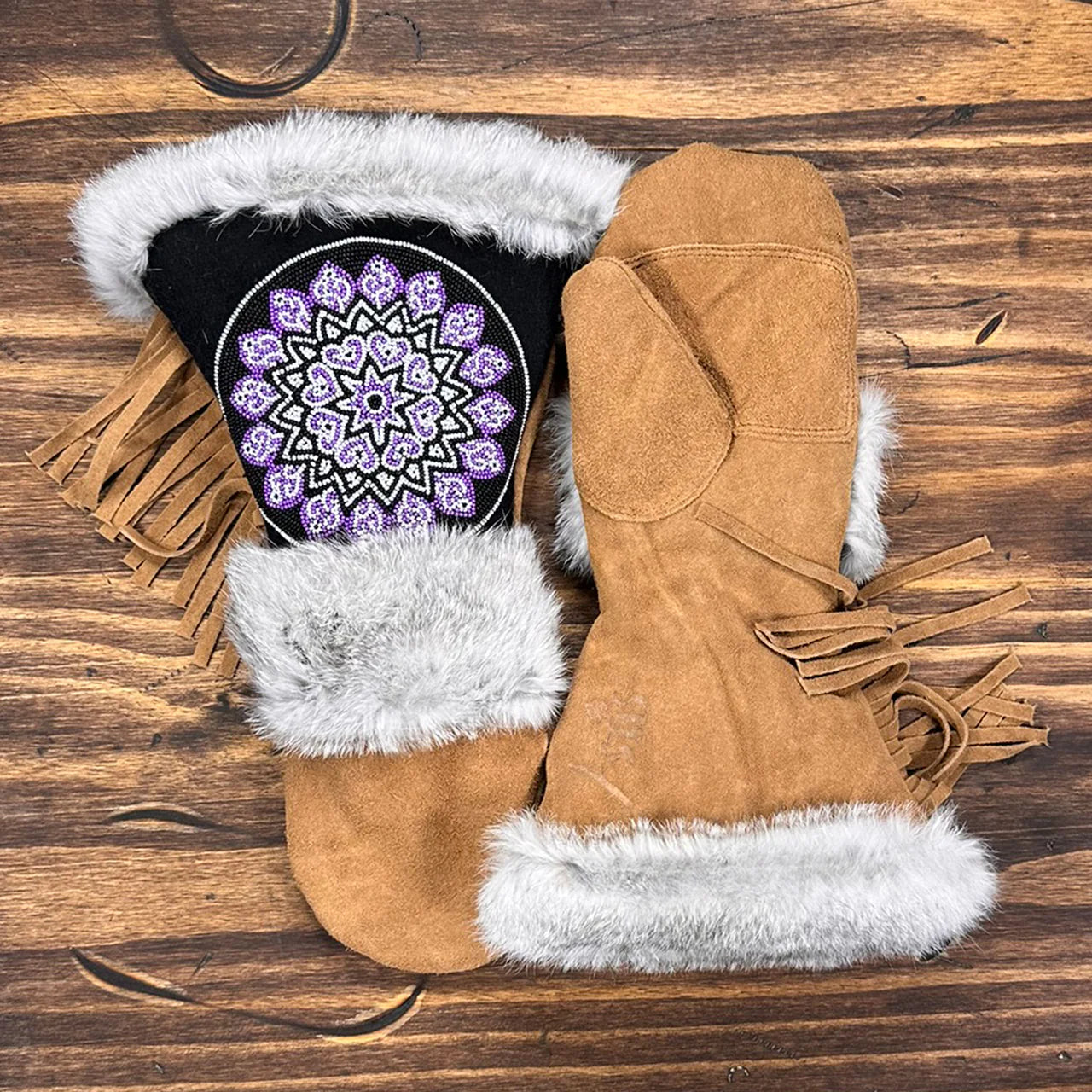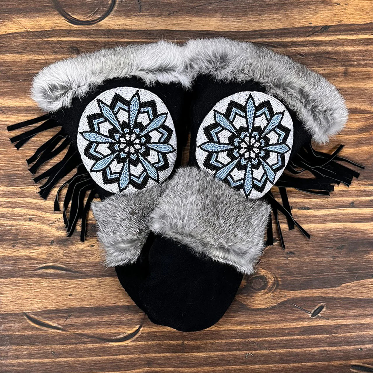 Experience unmatched warmth and comfort with the Pickerel Mittens, crafted for winter enthusiasts who value both function and beauty. Designed with practicality in mind, these mittens feature a gauntlet-style cuff that fits seamlessly over jacket sleeves to prevent bunching. The fur-trimmed cuff provides a snug seal, keeping snow and cold air out. Reinforced thumb and palm patches offer enhanced durability at high-wear areas, ensuring these mittens stand up to your toughest adventures. Plus, the intricate beadwork adds a touch of artistry to your winter gear.