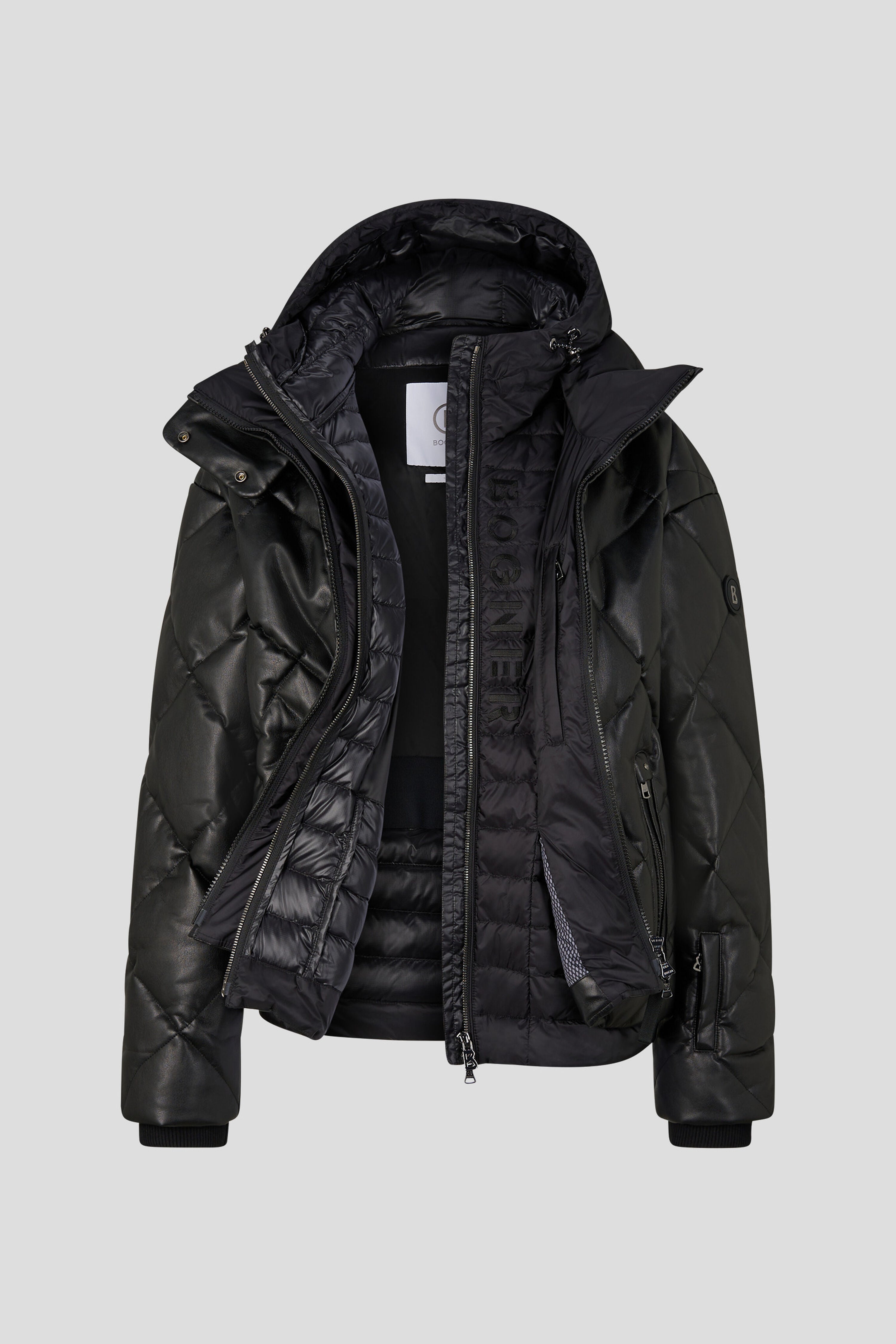 In a functional design made from coated technical leather, the Lissi down ski jacket is a great success as a key piece for alpine styles. The fixed hood’s quilted inlay, the adjustable two-way zippers and elasticated drawstrings in the hem ensure extra comfort. The warm down padding makes a masterful finish to this signature style.