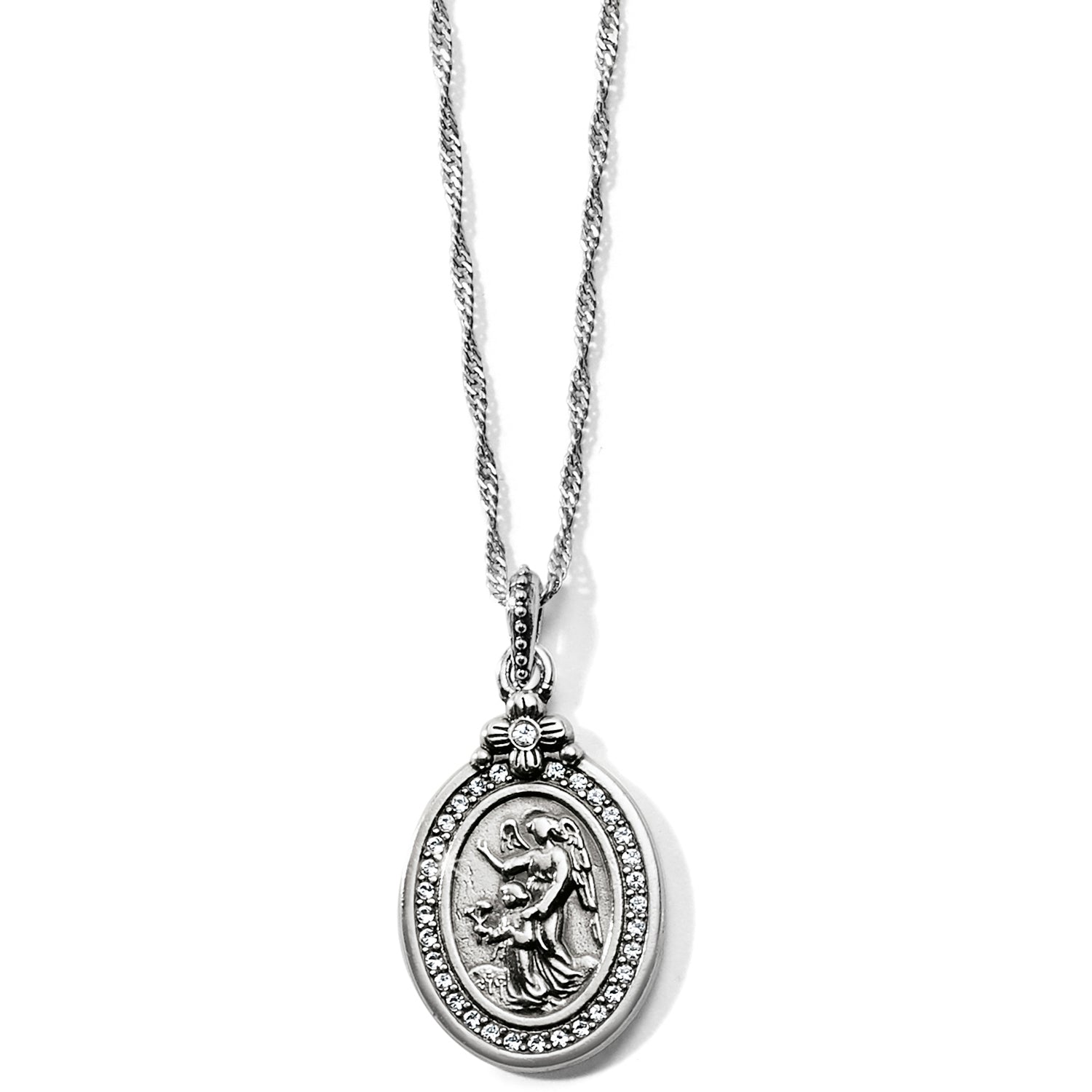 A guardian angel protectively watches over a small child on this drop pendant. This silver petite necklace is great for layering!