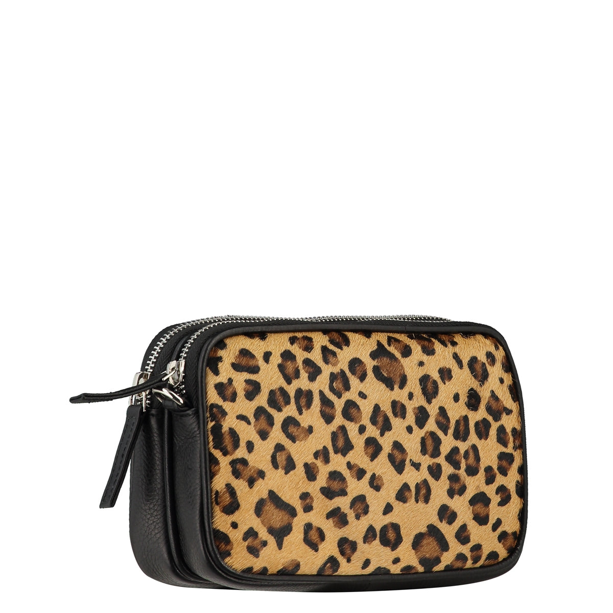 Cut from leopard print hair on hide calfskin Italian leather, this compact cross-body bag features two super useful compartments, silver-tone zipper closings, and a black cotton interior with a single pocket for all your small essentials….plus a little more.