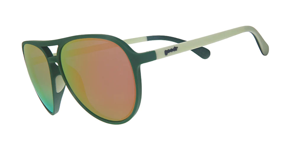 Introducing Goodrs very first Mach Gs with Flamingo Eye Technology. Goodr MACH Gs are a classic aviator style made to give you the speed if you feel the need. Plus, this smooth, sleek frame means no unsightly imprints on your nose from those weird nose pads on traditional metal aviator frames.