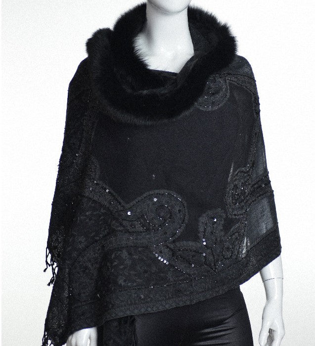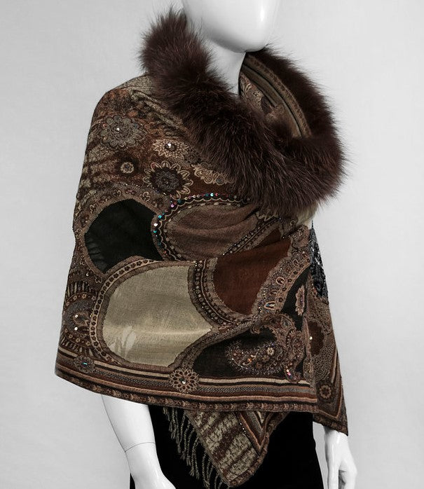 Mitchie's | Embroidered Woven Wrap With Fox Fur Trim