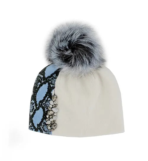 Stay warm and stylish with Mitchie's Knit Hat. The unique snakeprint and crystal embellishments add a touch of luxury. And the fox fur pom pom is not only a cute accessory, but also adds extra warmth. Perfect for any fashion-forward woman this winter season!