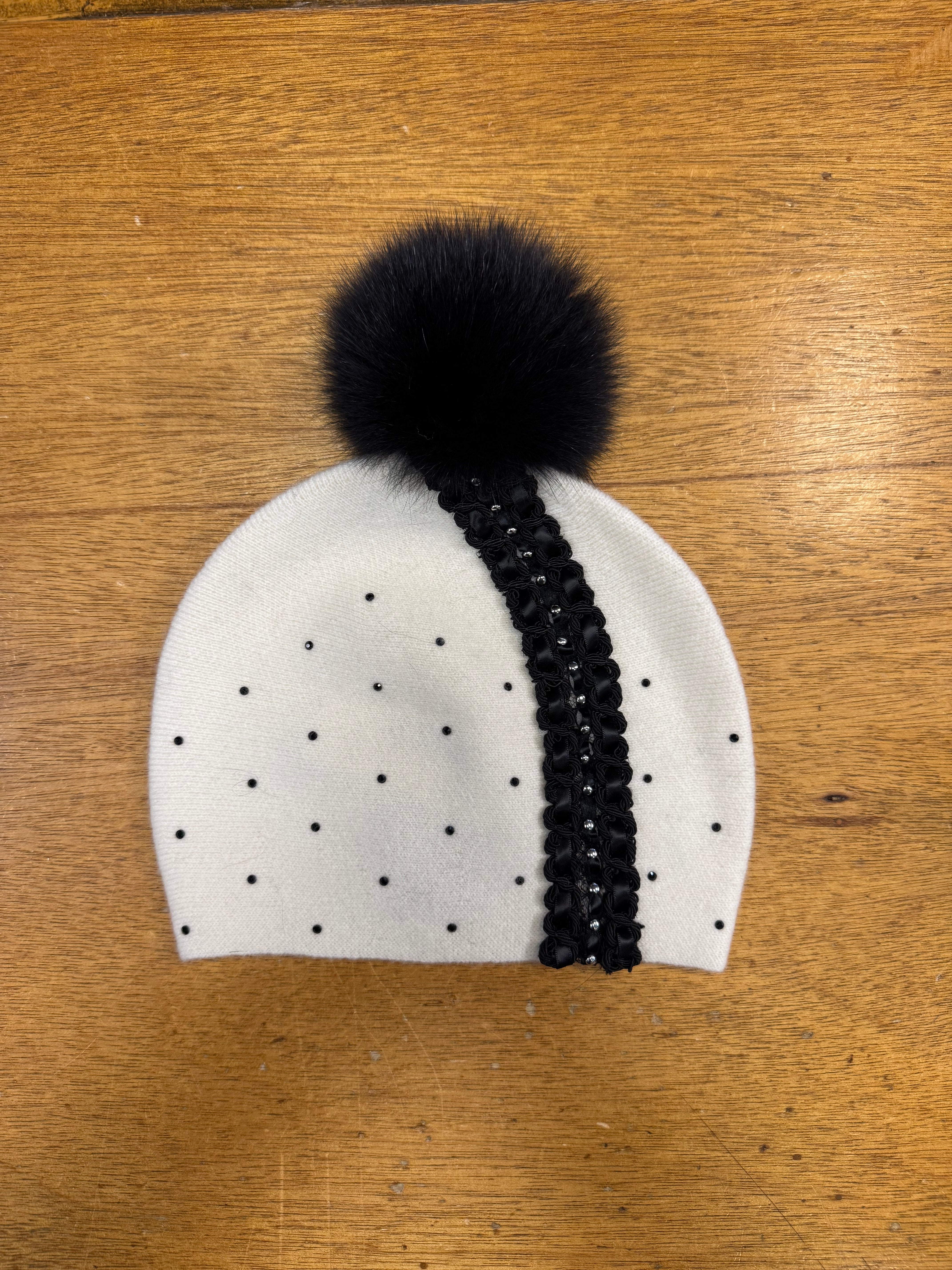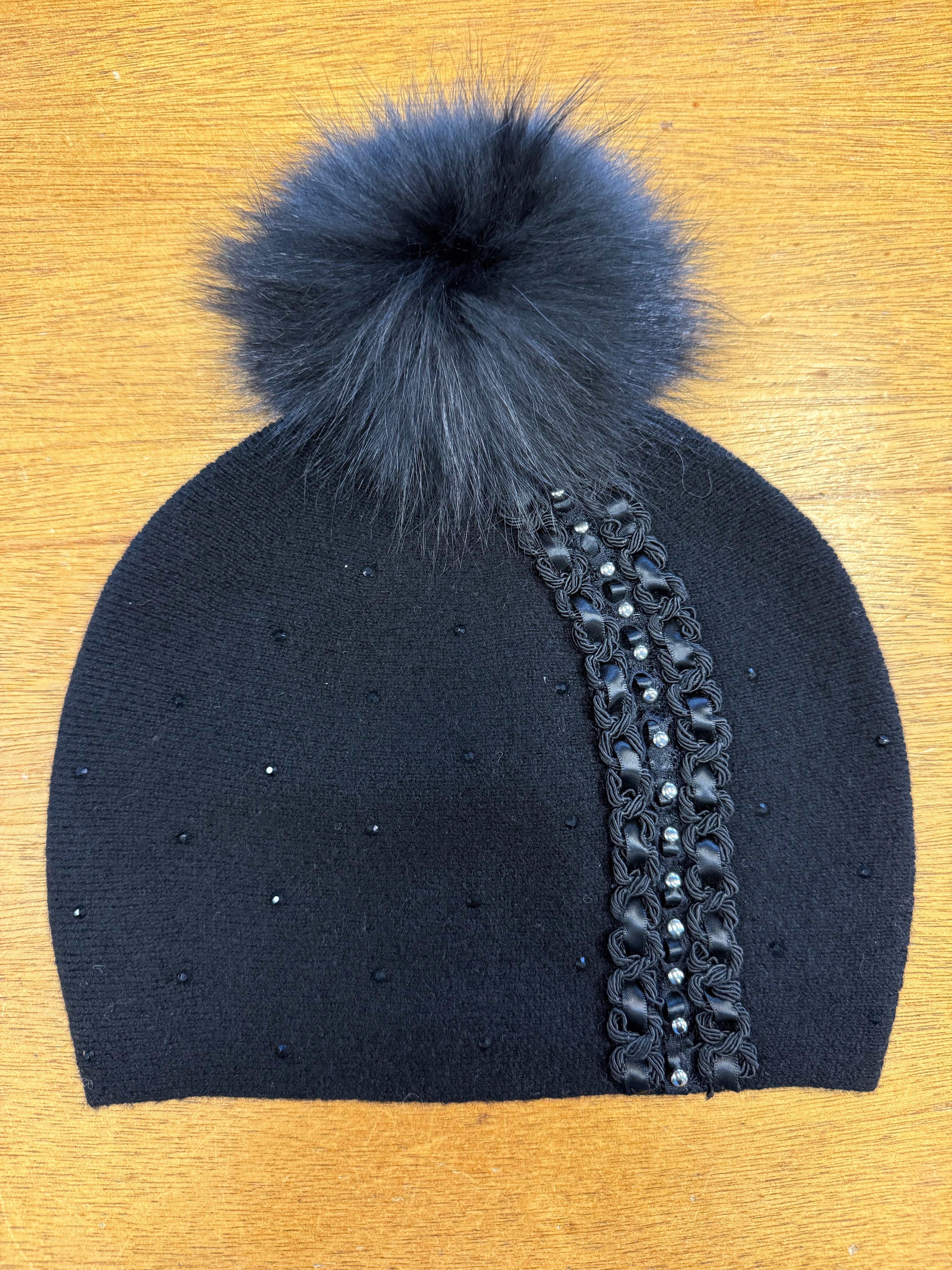Elegant Warmth: Mitchie’s Matchings Wool Hat with Braid Detail, Crystals & Fox Fur Pom
