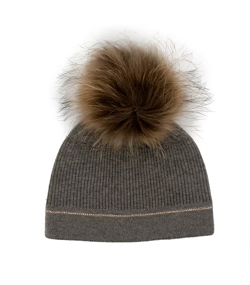 Mitchie's Matchings | Taupe and Crystals Knitted Hat with Fox Fur Pom | Women's