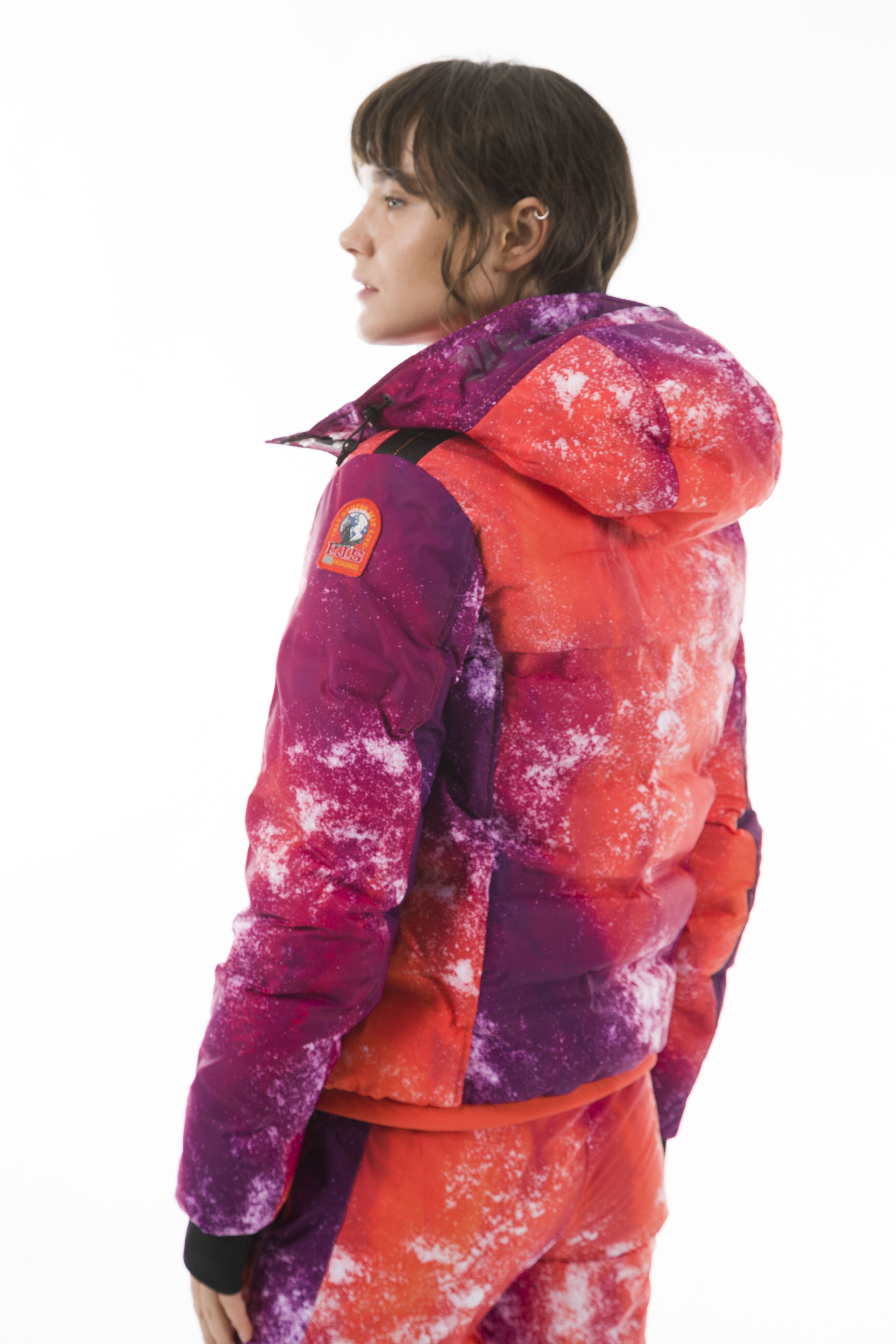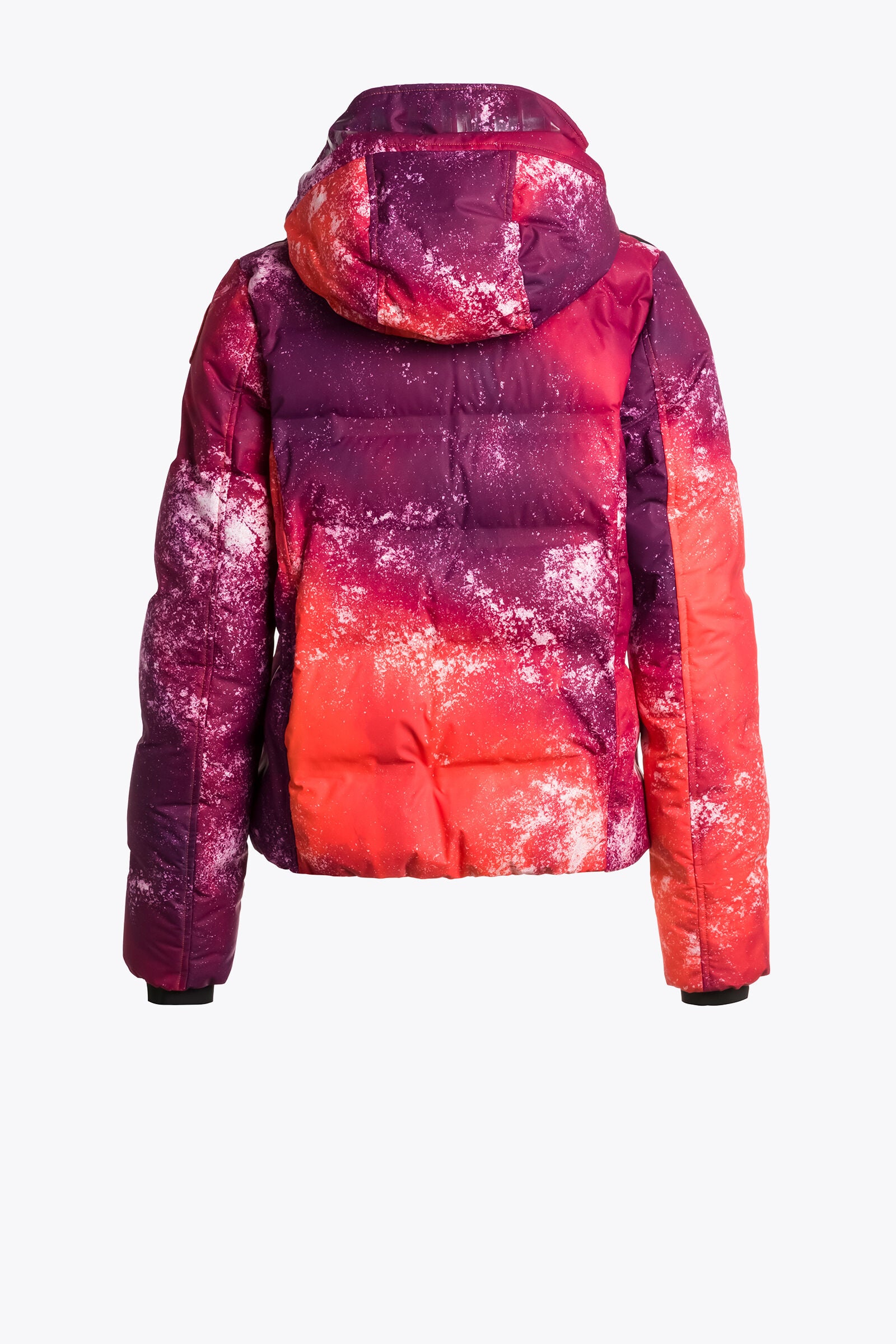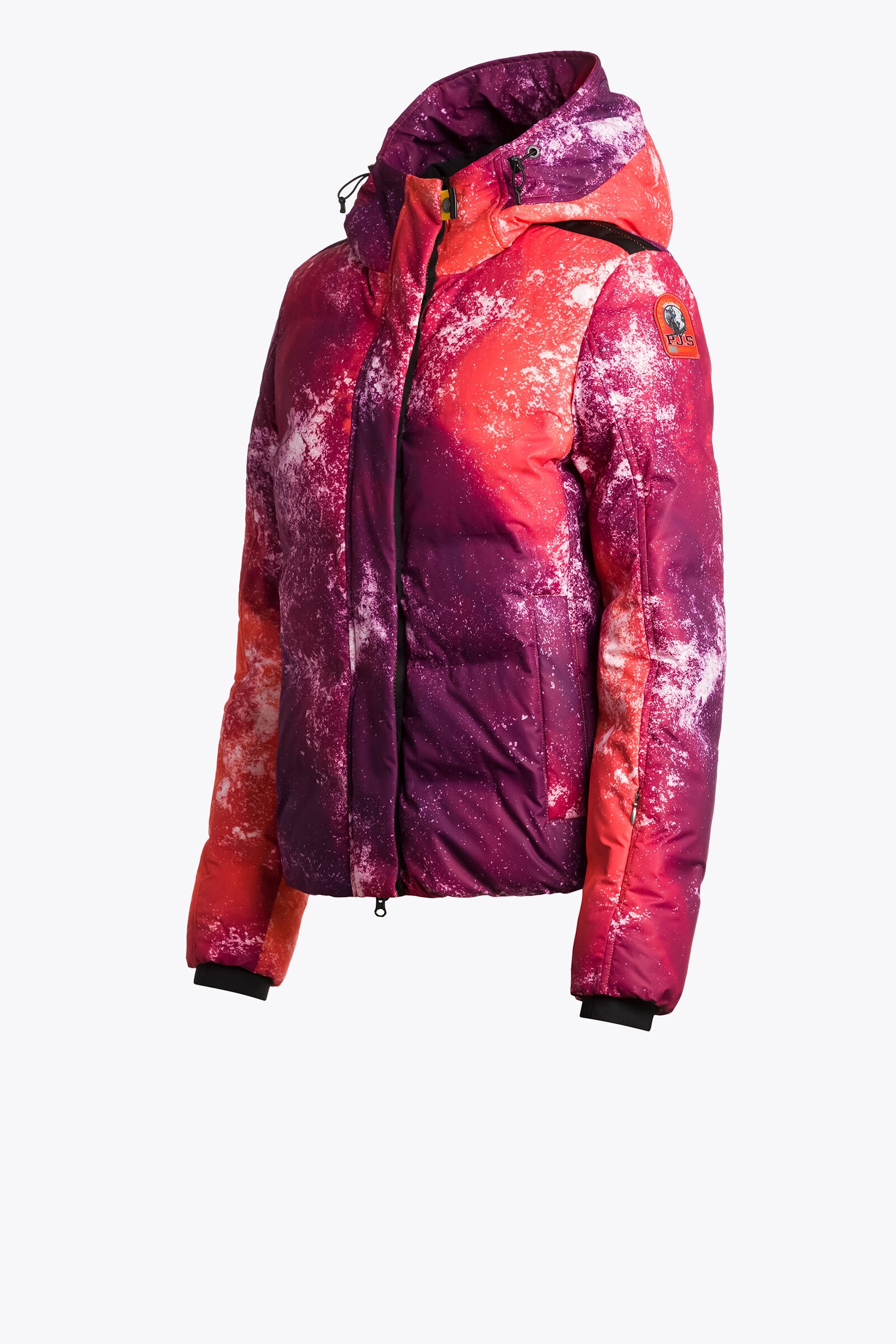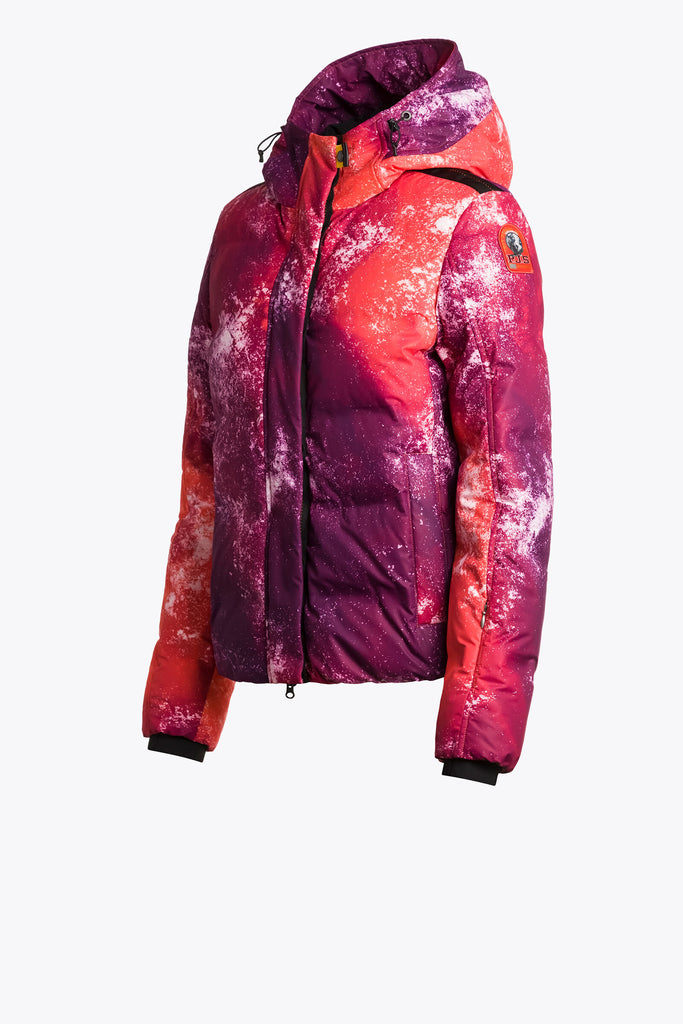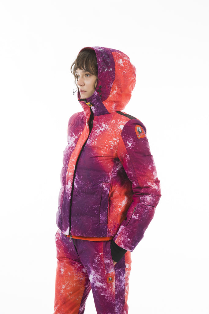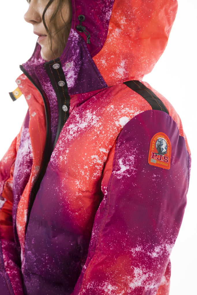 This ski jacket features a hood adjustable by means of drawstring and a transparent Parajumpers print on the rim, and a taped two-way zipper with button-up storm flap. Two taped zippered pockets, as well as one inner mesh pocket and a small invisible zippered pocket on the left sleeve. Powder gaiter and elasticated cuffs and bottom hem. Iconic details such as the patch and the yellow tape. The main fabric is a printed micro reps: micro reps on the face; polyurethane lamination on the back. The second fabric is a stretch 3-layer woven bonded softshell: stretch micro reps woven, with water-repellent treatment on the face; brushed polar fleece with squared structure. Bonded with 100% polyurethane lamination. Filling is 100% duck down.