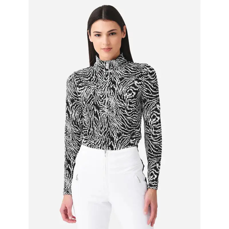 Elevate your ski wardrobe with the Sno Skins Animal Jacquard Half-Zip Baselayer for women. Made with stretchy fabric, this mid-layer provides warmth and breathability for all-day comfort. Its chic design is perfect for both on and off the slopes. Upgrade your style and performance with this versatile baselayer.