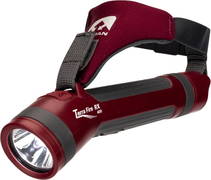 NATHAN® TERRA FIRE 400 RX HAND TORCH :: Headlamps are handy but can sometimes create shadows. Not so with the lightweight Nathan Terra Fire 400 RX Hand Torch. Keep hands relaxed with a grip-free strap while a downward pointing beam of ultra-bright 359 max lumens lights your way.