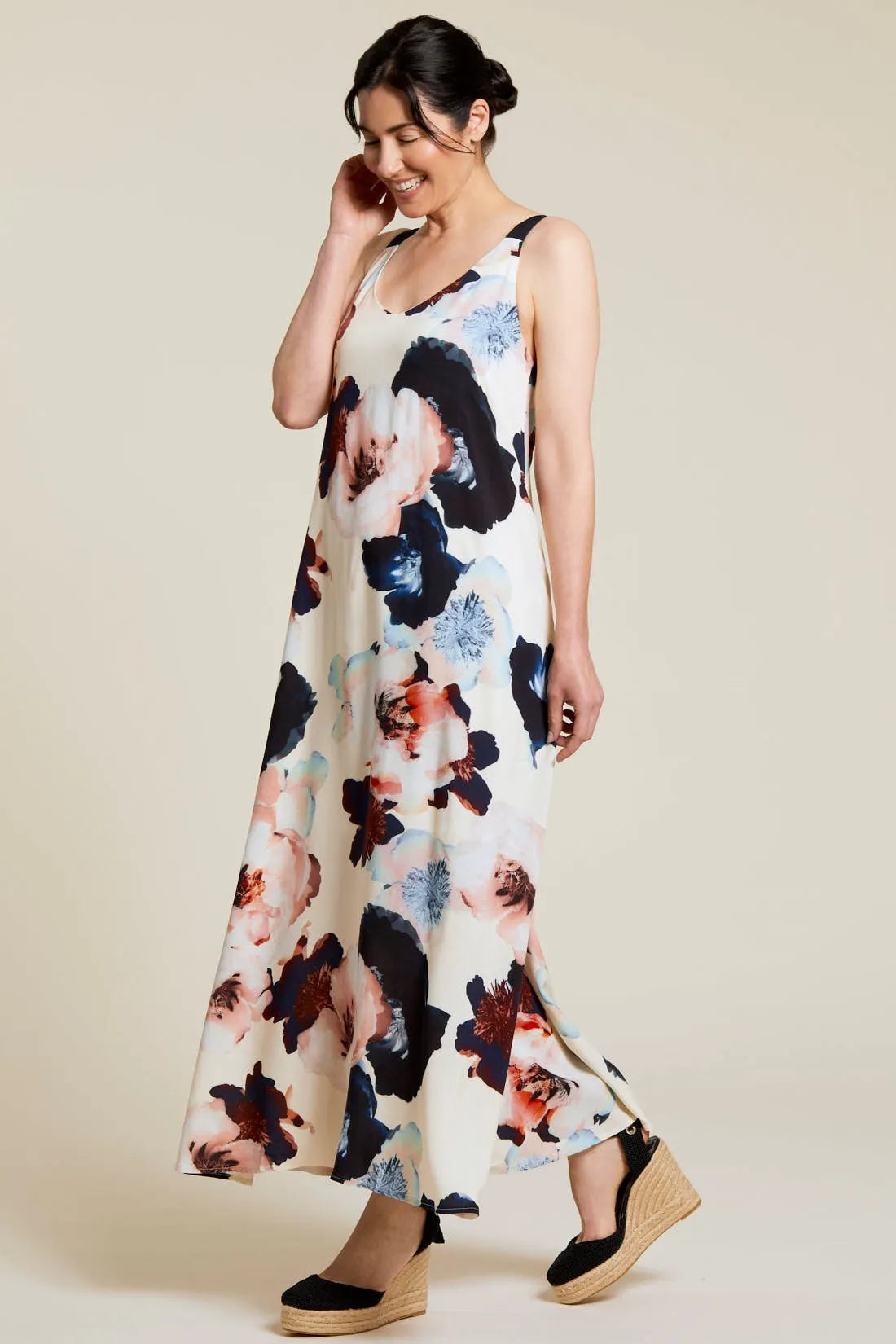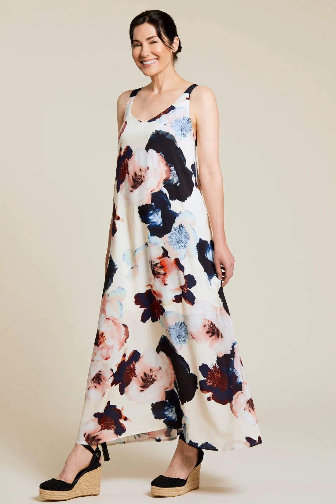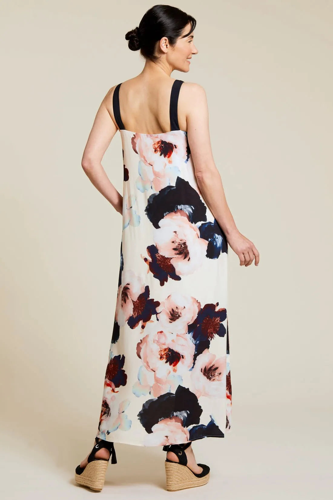 Take a fresh approach to your sunny-day lineup with this floor-length dress bursting with flowy comfort. We love the fully-lined interior, sleeveless design, printed challis fabric with contrast straps, and handy side-seam pockets. It's low-maintenance elegance at its finest.