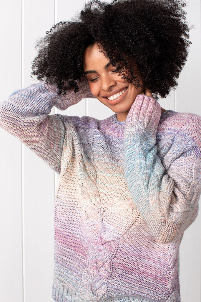Make a statement even in a simple sweater when you choose a piece packed with stylish details. This sweater puts a fresh spin on classic elements, with its unique cable knit pattern, multi-color space dye pattern, and drop shoulder design. Wear it with any pair of jeans in your closet and add your favourite ankle boots for an instant outfit that you'll want to wear on repeat.