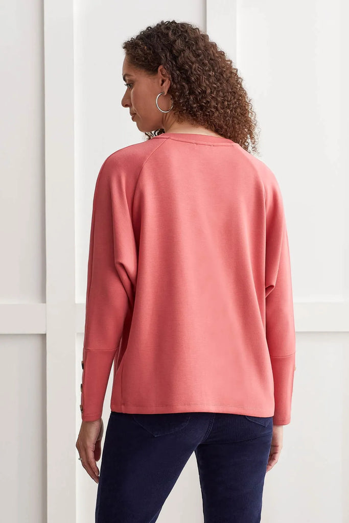 Everyday clothing just got a whole lot more fashionable. We love how this long-sleeve top matches everything in our wardrobe! We can't get enough of the pop-over crew neck, loose fit, long raglan sleeves adorned with marble buttons at the cuff, and the scuba knit fabric that holds its shape over time while staying stretchy.
