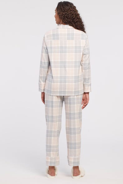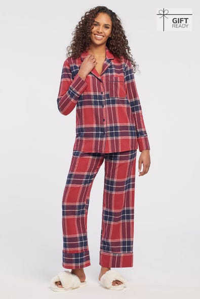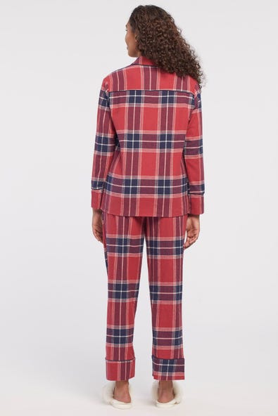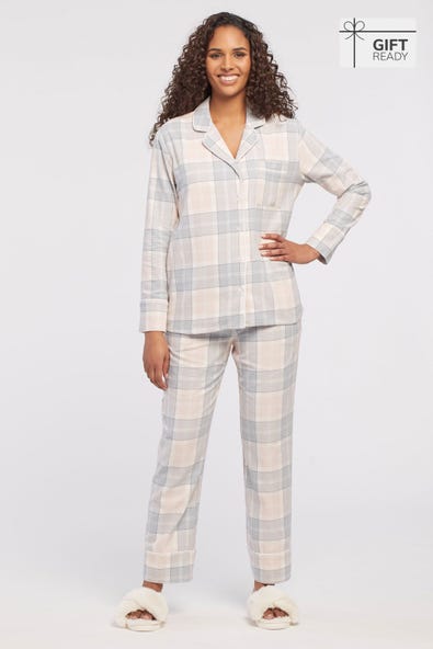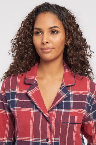 Look forward to bedtime when you can slip into these soft flannel pajamas that are just as cozy as they are cute. A relaxed wide leg and elastic waist make these bottoms the perfect pair to wear for lights out and the long sleeve button-front top adds a classic look and the comfort you crave.
